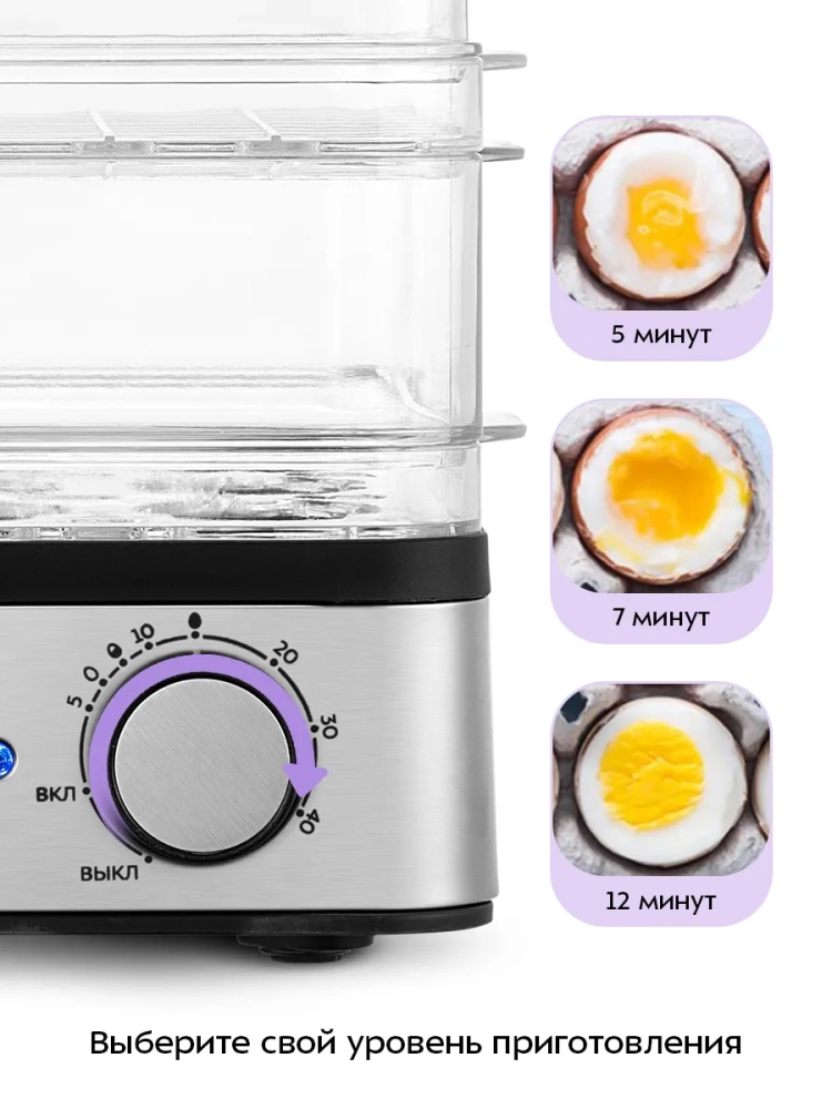 Благодаря двум уровням в данной яйцеварке вы можете варить до 8 яиц на первом уровне и другие продукты на втором уровне одновременно. Основание с углублениями для яиц делает приготовление яиц более удобным.