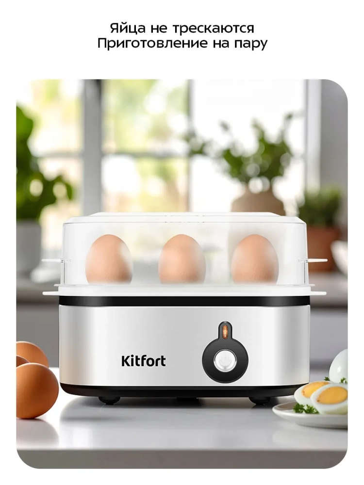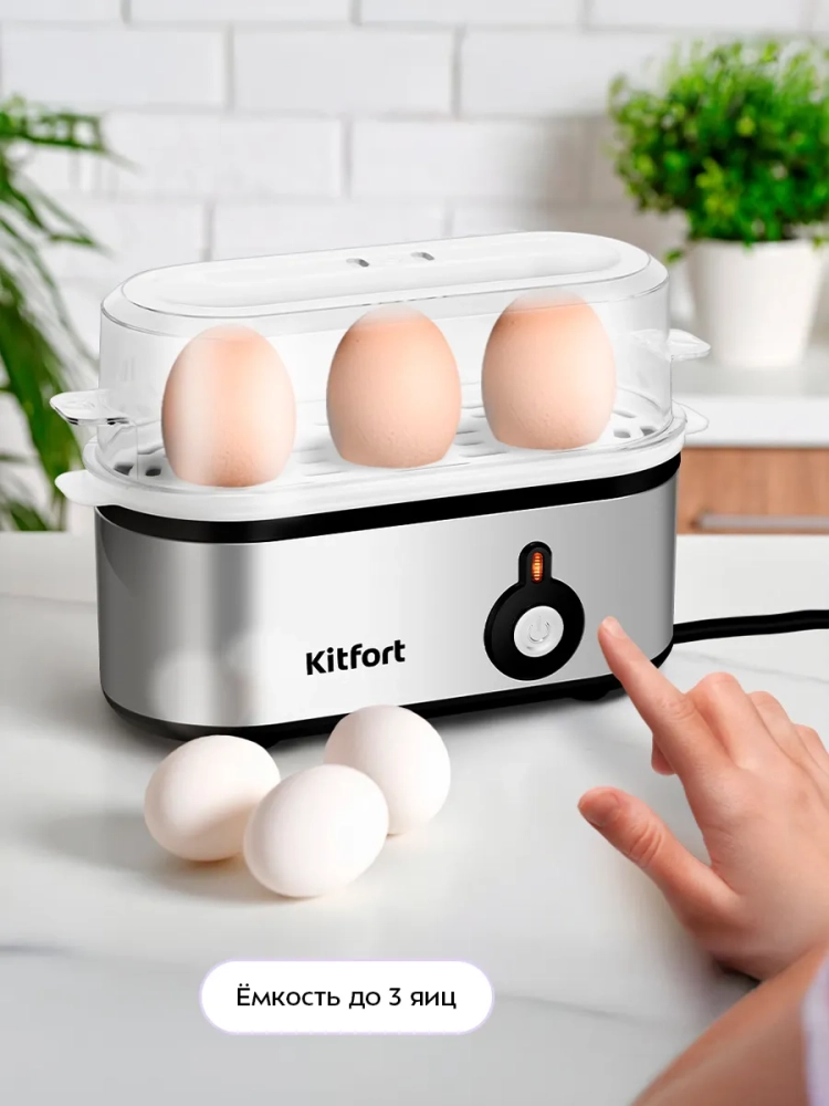 Яйцеварка Kitfort КТ-6935 предназначена для варки яиц на пару. Вареные яйца — неотъемлемый элемент вкусного, полезного, а самое главное, простого завтрака. Иногда в утренней спешке не получается аккуратно положить яйца в кастрюлю с водой или вода слишком горячая, и яйца бьются друг о друга.