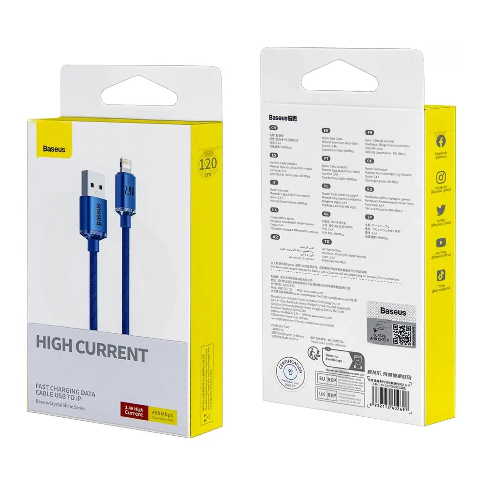 Кабель USB Lightning 1.2M 2.4A Crystal Shine Series Fast Charging Baseus синий CAJY000003