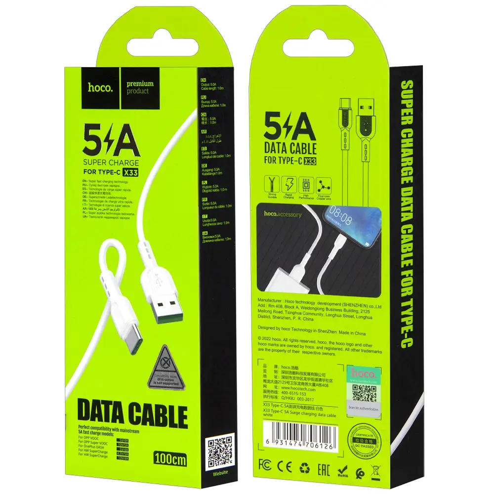 Кабель X33 USB Type-C 1M HOCO белый