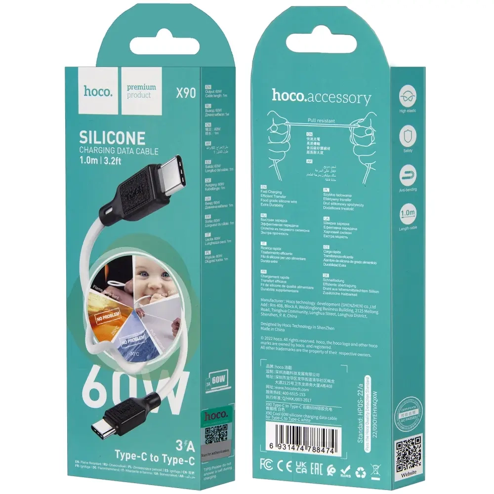Кабель X90 Type-C на Type-C 1m 60W 3A HOCO белый
