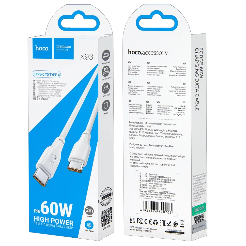 Кабель X93 Type-C на Type-C 2m 3A 60W HOCO белый