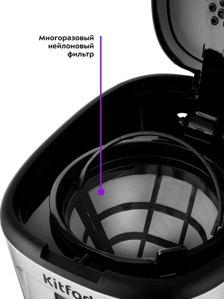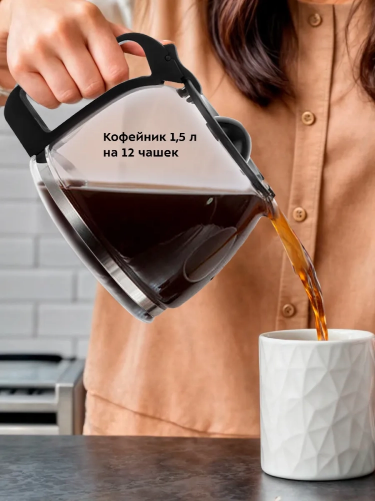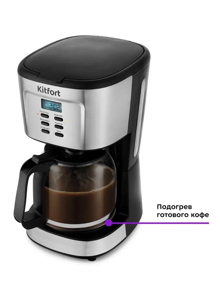 Капельная кофеварка электрическая с подогревом КТ-727 от Kitfort — это превосходный выбор для ценителей ароматного кофе. Эта электрокофеварка, работающая по капельному принципу, позволяет приготовить вкусный напиток из молотого кофе. Вода в кофеварке нагревается до температуры 80-90 °С и медленно проходит через фильтр с молотым кофе, после чего попадает в кофейник. По завершении процесса приготовления устройство автоматически переходит в режим подогрева с автоотключением, поддерживая температуру готового напитка в стеклянной колбе на платформе с подогревом в течение 40 минут. Это удобно для тех, кто предпочитает наслаждаться горячим кофе без спешки. Идеальный подарок на любой случай: на Новый год, 23 февраля, 8 марта, день рождения, свадьбу или юбилей! Капельная система оснащена противокапельным затвором: вы можете налить себе чашку свежего кофе даже во время его приготовления без риска проливания. Резервуар объемом 1 л. 600 мл. позволяет за один раз приготовить до 12 чашек по 130 мл каждая — отличный выбор как для дома, так и для офиса. Прозрачный корпус кофейника дает возможность контролировать уровень оставшегося кофейного напитка. На задней части корпуса предусмотрен удобный отсек для хранения шнура питания. Эта модель от Китфорт отличается не только функциональностью и простотой использования, но и стильным дизайном. Аппарат станет отличным дополнением к любой кухне или офису благодаря своему современному внешнему виду. Кофеварка Kitfort КТ-727 предназначена исключительно для использования с молотым кофе и обеспечивает качественное приготовление вашего любимого напитка каждый день.