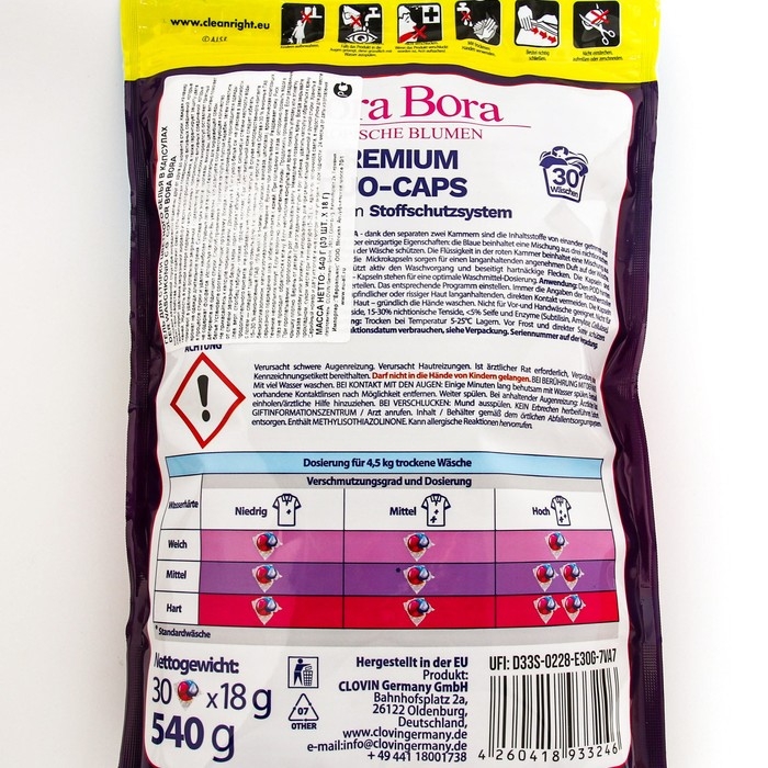 Способ применения: положите капсулу в пустой барабан, затем поместите белье, установите соответствующую программу. Всегда следуйте рекомендациям производителей одежды.