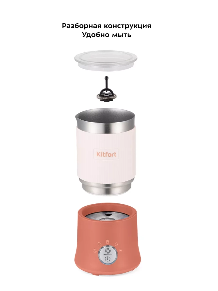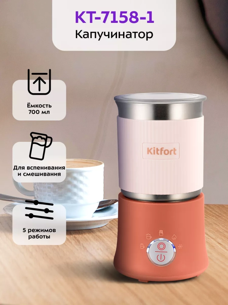 Капучинатор Kitfort КТ-7158 — это устройство для приготовления молочной пенки, используемой для напитков на базе эспрессо: капучино, латте и латте макиато. Прибор работает в 5 режимах: молочная пенка с подогревом и без подогрева, а также смешивание с подогревом, вспенивание без подогрева и приготовление горячего шоколада.