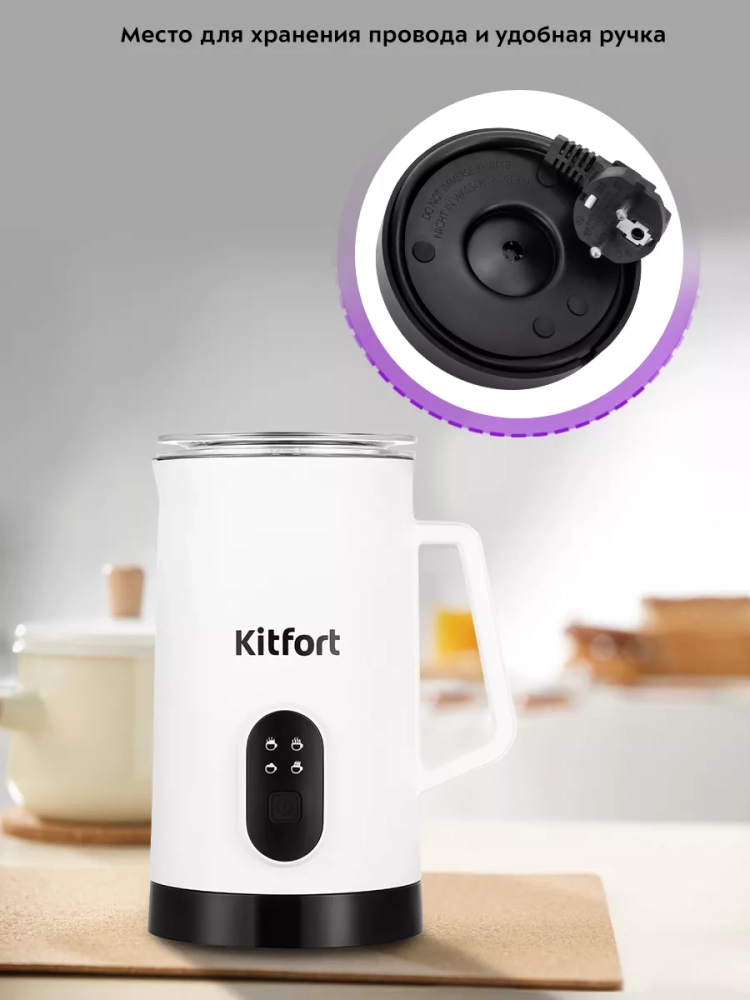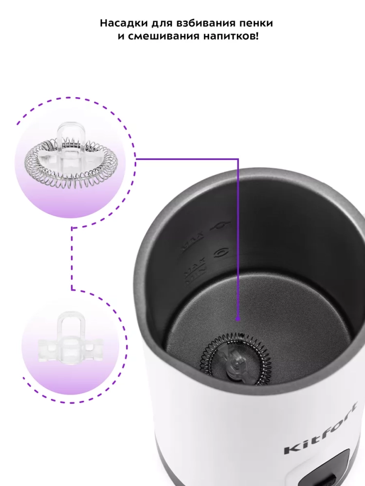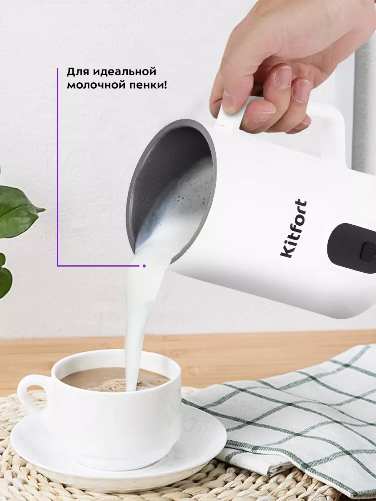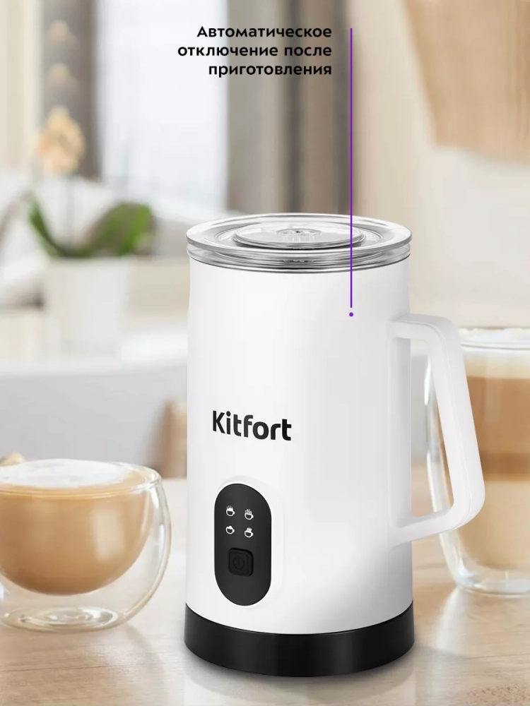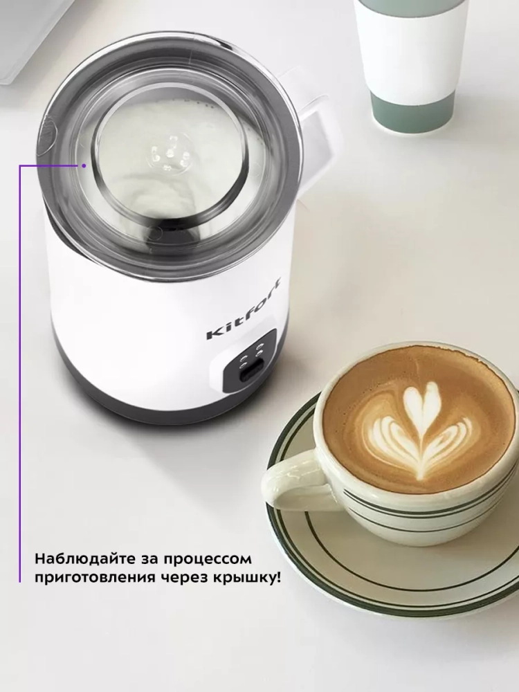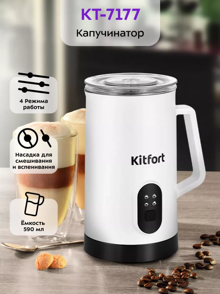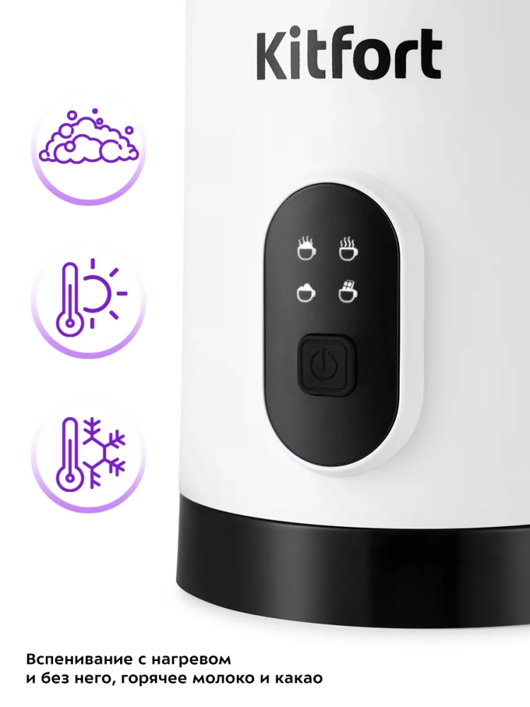 Капучинатор Kitfort КТ-7177 — это устройство для приготовления молочной пенки, используемой для напитков на базе эспрессо: капучино, латте и латте макиато. Прибор работает в четырех режимах: молочная пенка с нагревом и без, горячее молоко и какао.