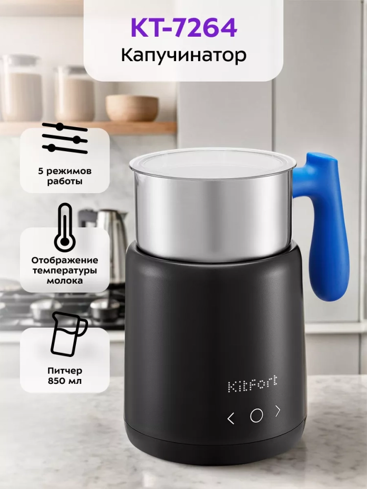 Капучинатор Kitfort КТ-7264 — это устройство для приготовления молочной пенки, используемой для напитков на базе эспрессо (капучино, латте и латте макиато) или какао (горячего шоколада). Прибор работает в 5 режимах: плотная пенка, легкая пенка, холодное вспенивание, подогрев молока, горячий шоколад.