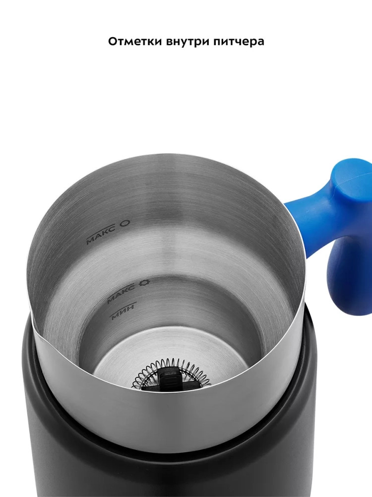 Питчер изготовлен из нержавеющей стали. Ручка питчера пластиковая, не нагревается и удобно лежит в руке. В комплекте одна насадка с пружинкой.