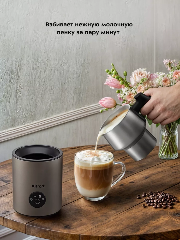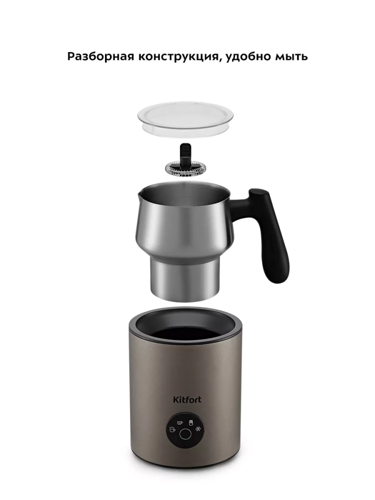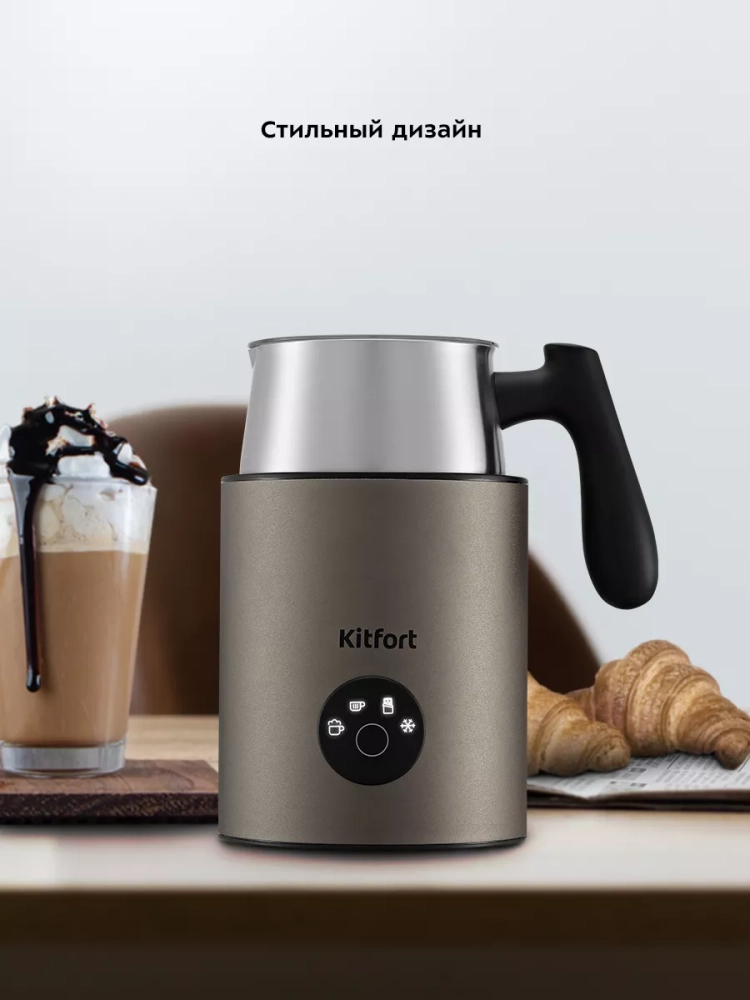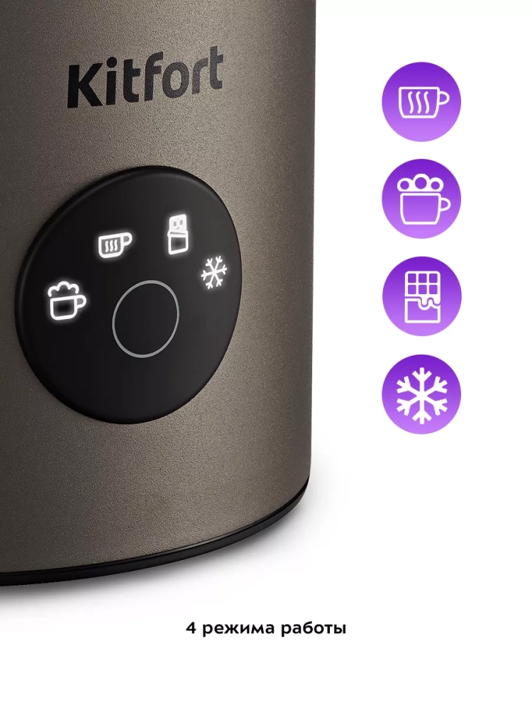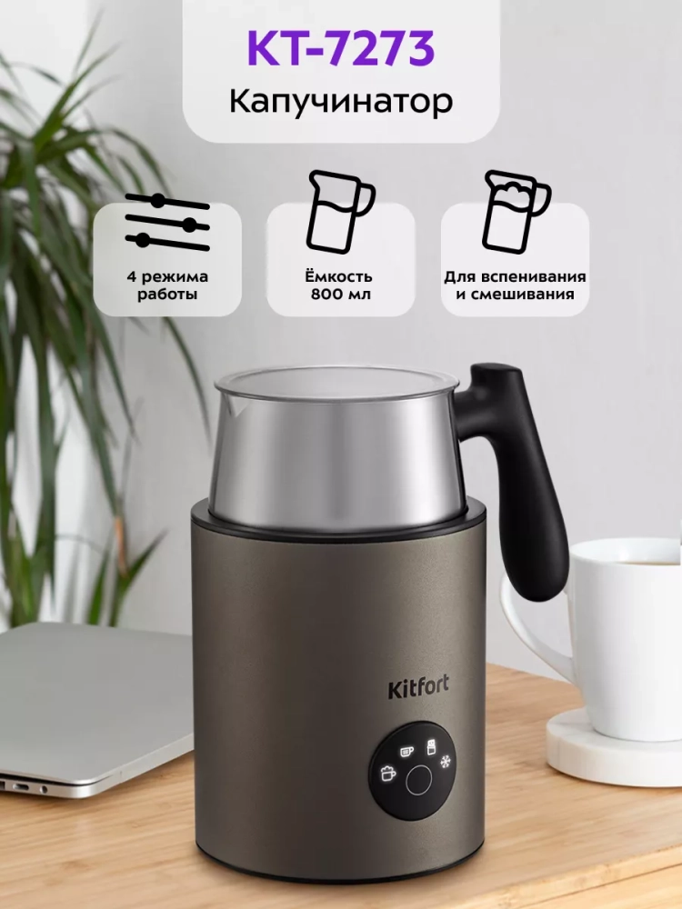 Капучинатор Kitfort КТ-7273 — это устройство для приготовления молочной пенки, используемой для напитков на базе эспрессо (капучино, латте и латте макиато), и какао. Прибор работает в 4 режимах: вспенивание с подогревом, смешивание с подогревом, холодное вспенивание и какао.