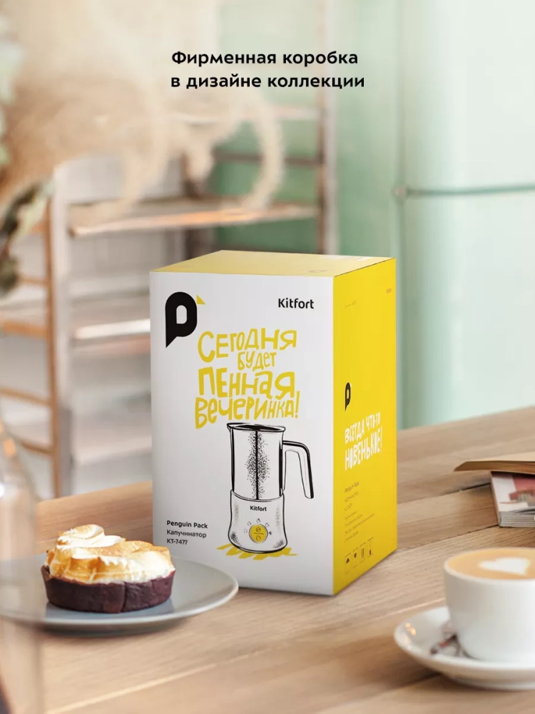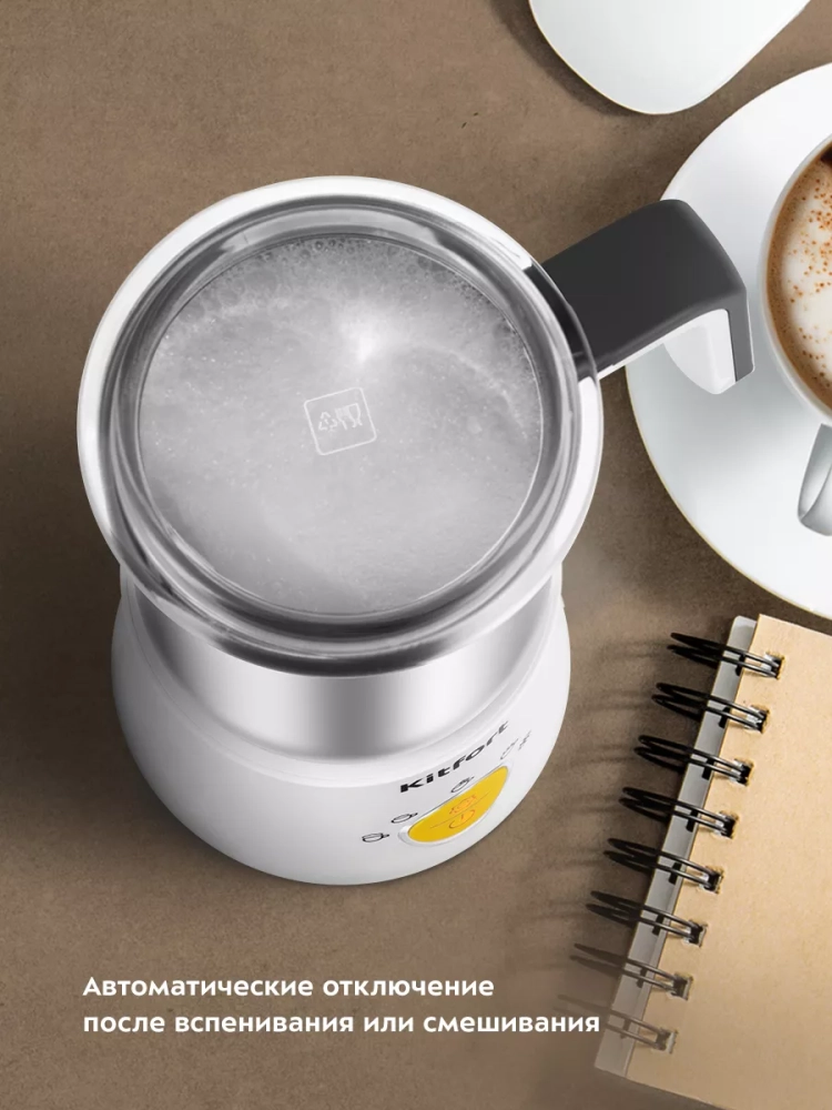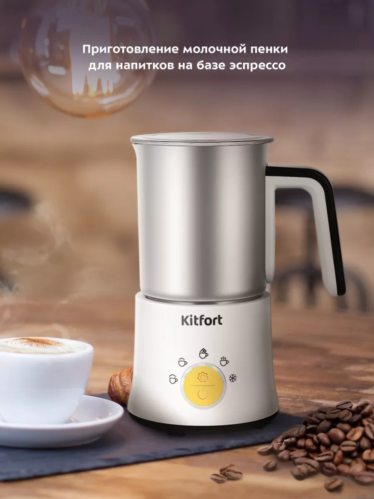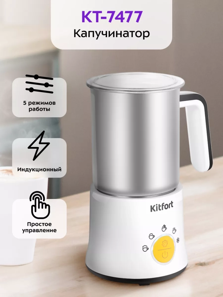 Капучинатор Kitfort КТ-7477 — это устройство для приготовления молочной пенки, используемой для напитков на базе эспрессо: капучино, латте и латте макиато. Прибор работает в пяти режимах: плотная и воздушная молочная пенка с нагревом, приготовление какао, смешивание с нагревом и вспенивание без нагрева.