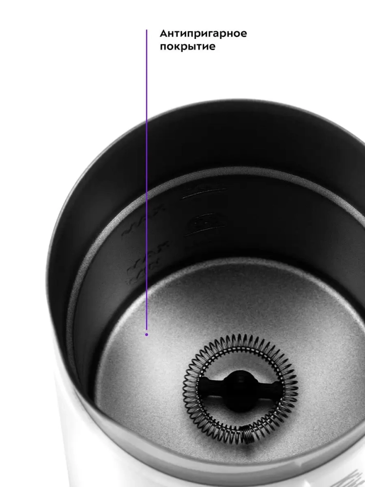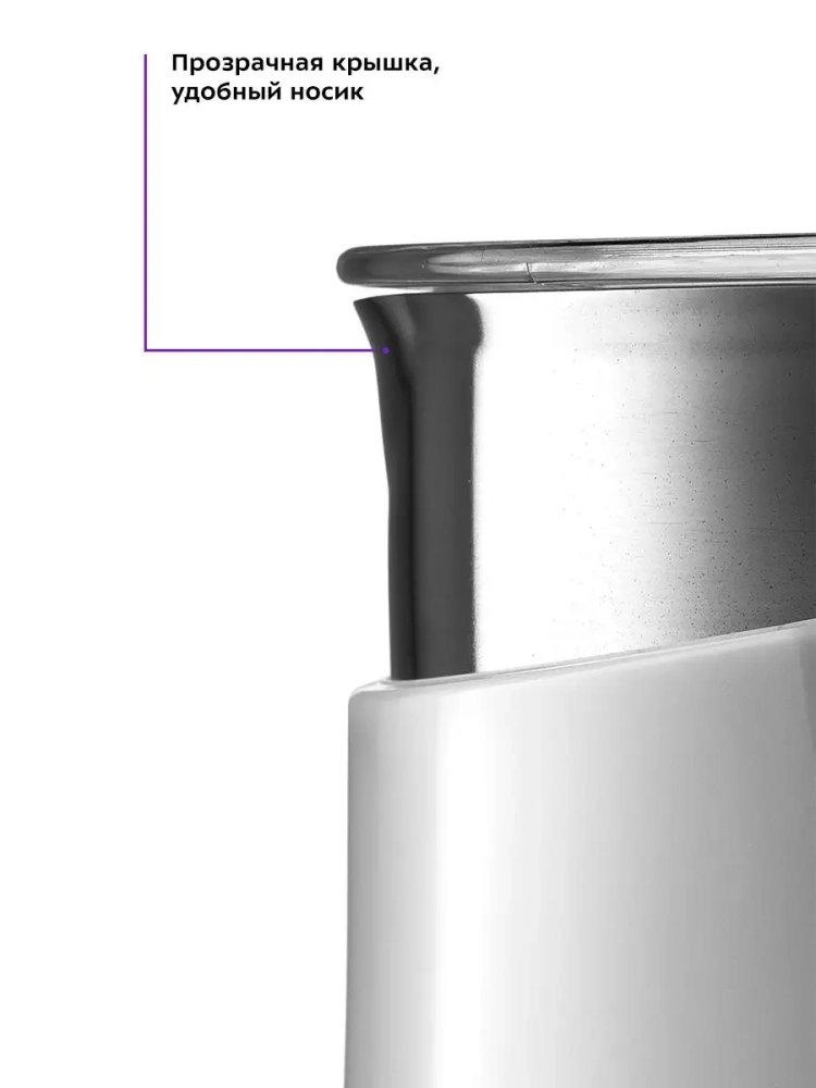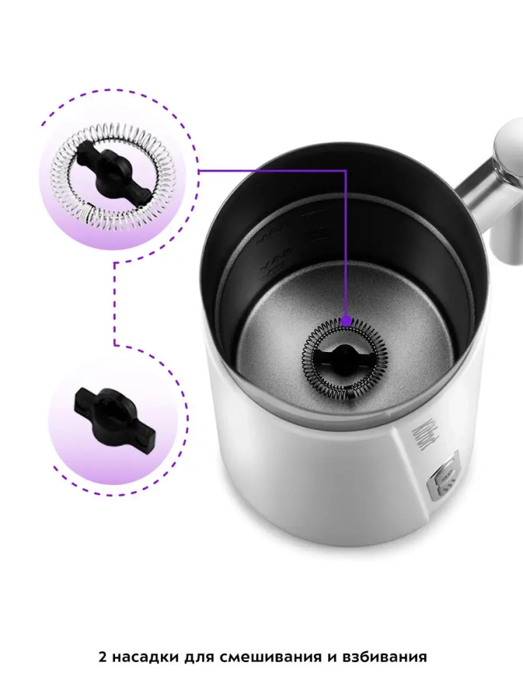 Капучинатор автоматически отключается, когда процесс взбивания или смешивания выполнен. В комплекте 2 насадки: для взбивания и перемешивания. Через прозрачную крышку можно наблюдать за приготовлением.