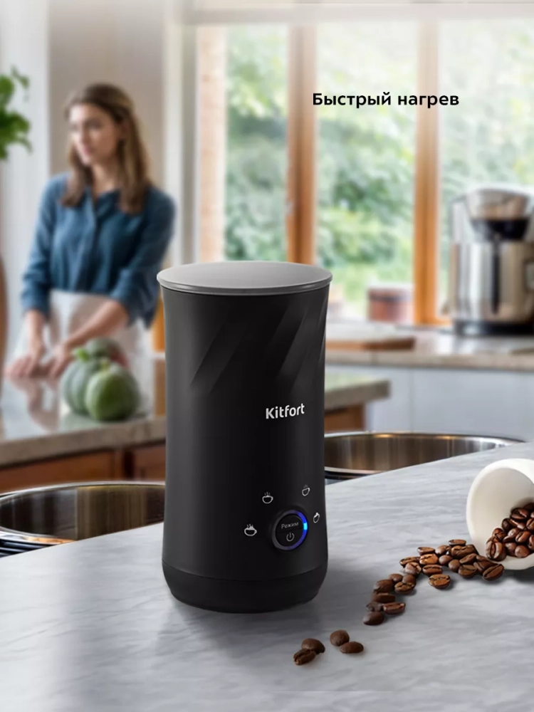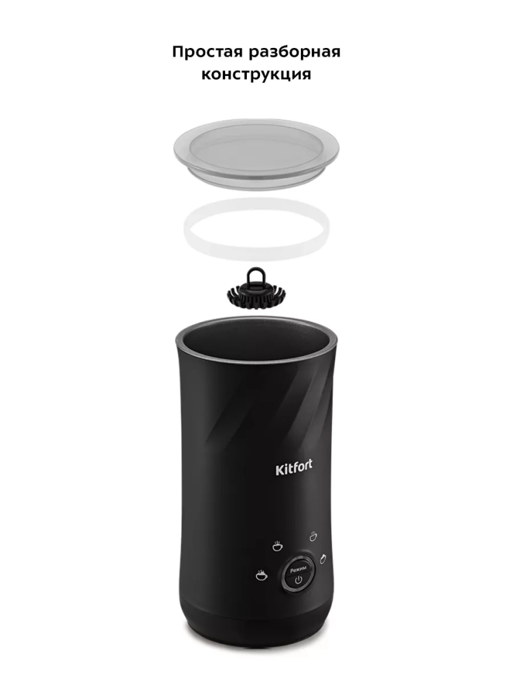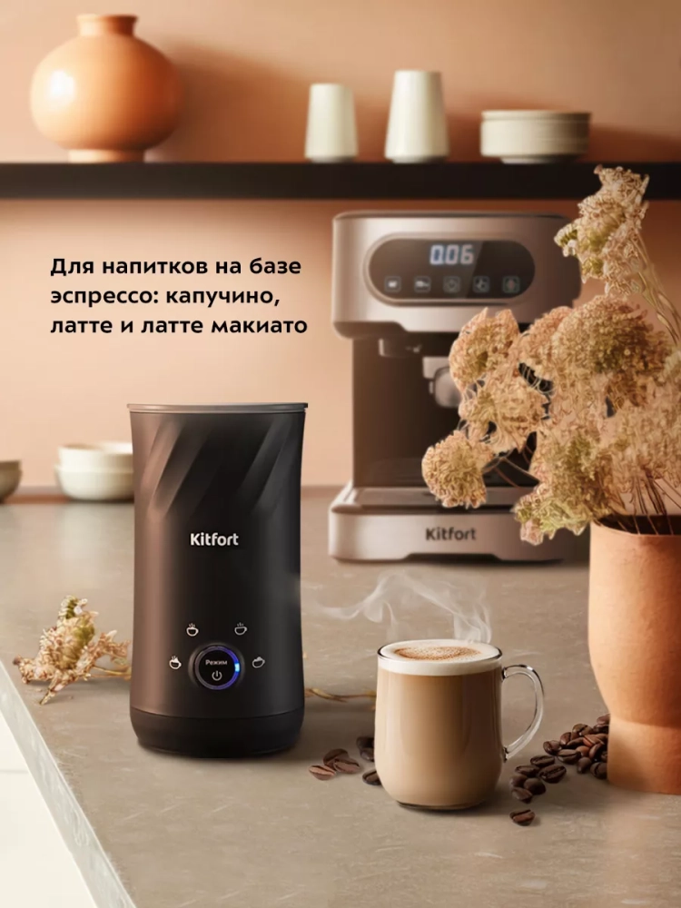 Капучинатор Kitfort КТ-7214 — это устройство для приготовления молочной пенки, используемой для напитков на базе эспрессо: капучино, латте и латте макиато. Прибор работает в четырех режимах: приготовление густой пенки с подогревом, приготовление воздушной пенки с подогревом, смешивание с подогревом и вспенивание без подогрева.