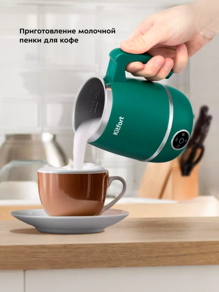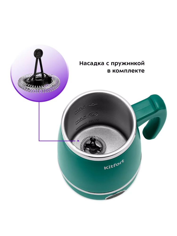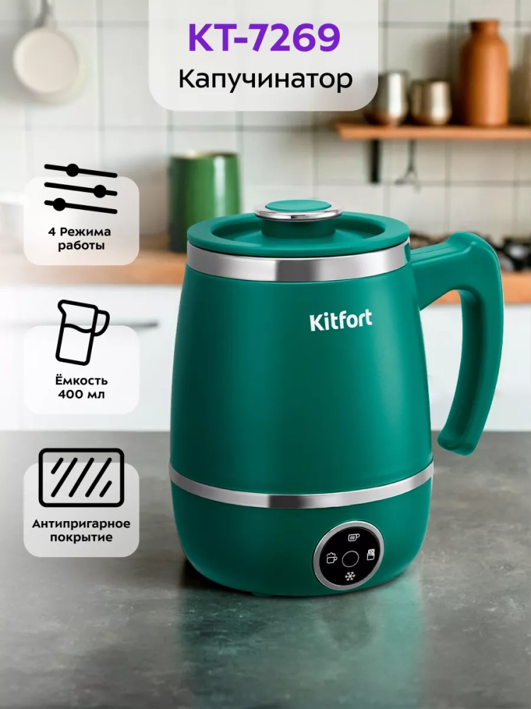 Капучинатор Kitfort КТ-7269 — это устройство для приготовления молочной пенки, используемой для напитков на базе эспрессо: капучино, латте и латте макиато. Прибор работает в 4 режимах: вспенивание с подогревом, смешивание с подогревом, холодное вспенивание и какао.