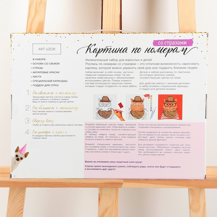 Рисунок разделён на множество мелких фрагментов, на каждом из которых указано число, соответствующее цвету, которым нужно закрасить данный участок. В набор входят все необходимые оттенки красок, каждый из которых пронумерован. Поначалу, когда вы только возьмёте рисунок в руки, будет сложно представить, что за чудесная картина получится в итоге! Но уверяем вас, результат превзойдёт все ожидания. Полотно с множеством оттенков, теней, красок и страз будет выглядеть так, словно оно из музея.