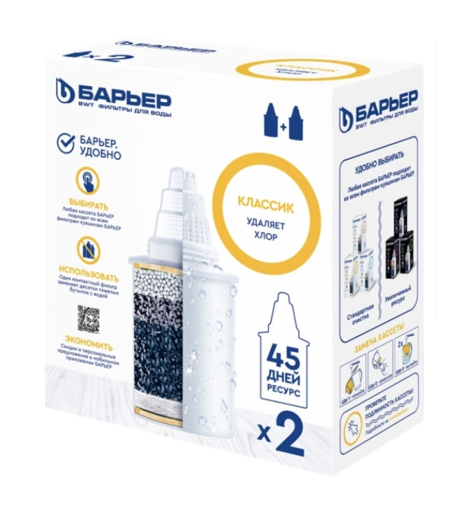 Кассета сменная БАРЬЕР Классик, удаление хлора, 2шт Материал Пластик, полипропилен, фильтрующие элементы Цвет (NF) Белый Количество штук в упаковке 2 Размер/Формат 6,4х6,4х14,6см Вид упаковки Картонная упаковка Страна Россия. Кассета сменная БАРЬЕР Классик эффективно нейтрализует хлор, а также очистит воду от других вредных примесей. Кокосовый активированный уголь, обработанный серебром, предотвращает рост бактерий, а ионообменное волокно удаляет тяжелые металлы и растворенное железо. Сменный блок имеет рабочий ресурс до 200л. Кассета подходит ко всем фильтрам-кувшинам БАРЬЕР. Набор укомплектован 2 картриджами.
