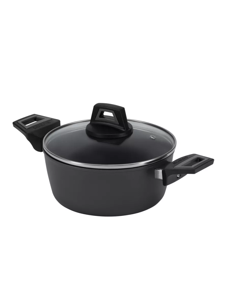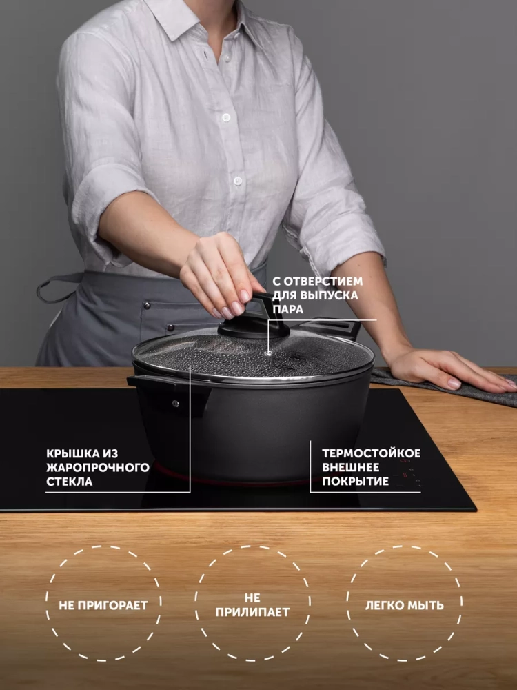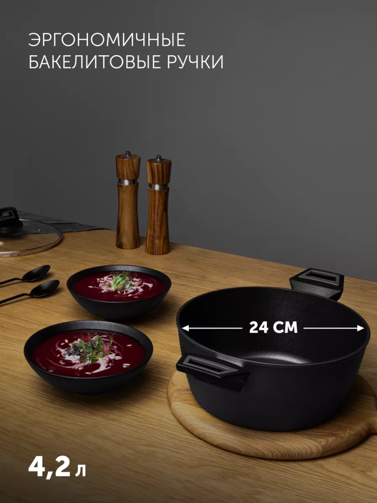 Эргономичные бакелитовые ручки с покрытием ""Soft Touch”, не нагреваются, как металлические ручки и ручки из пластика. Рукоятки с покрытием ""Soft Touch обеспечивают надежную сцепку с посудой и гарантирует безопасность во время приготовления пищи. Стеклянная прозрачная крышка (диаметр 24 см) выполнена из жаропрочного стекла с отверстием для выпуска пара.