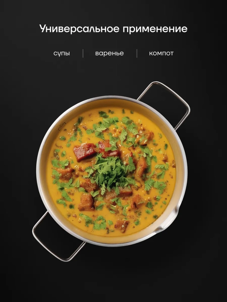Многофункциональная кастрюля оснащена стеклянной прозрачной крышкой (диаметр 24 см) из жаропрочного стекла. Наличие носика на самом корпусе кастрюли и перфорации по бокам крышки облегчают слив лишней жидкости во время приготовления пищи. Ручки не нагреваются во время готовки, что позволяет безопасно и комфортно перемещать посуду. Можно использовать на газовой, электрической, индукционной и керамической плите.
