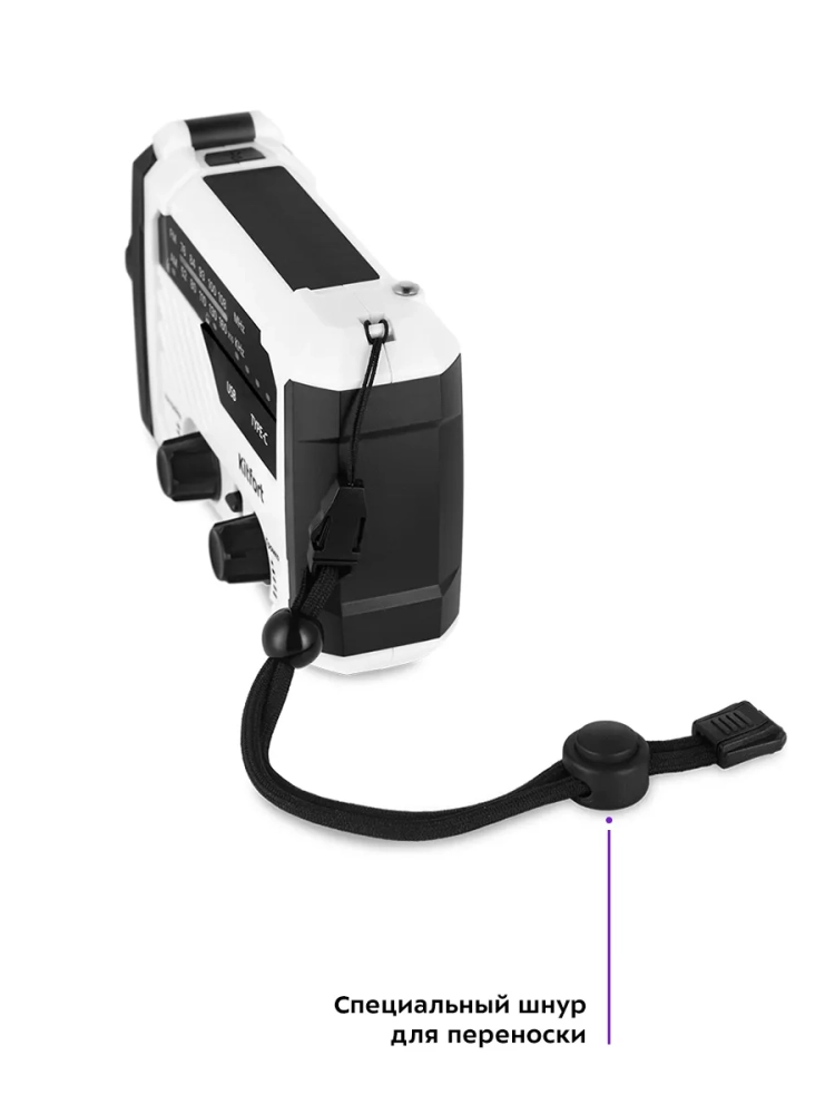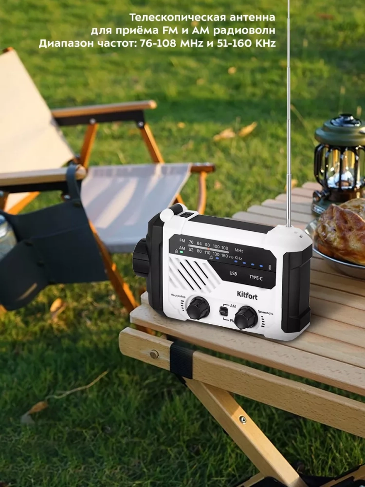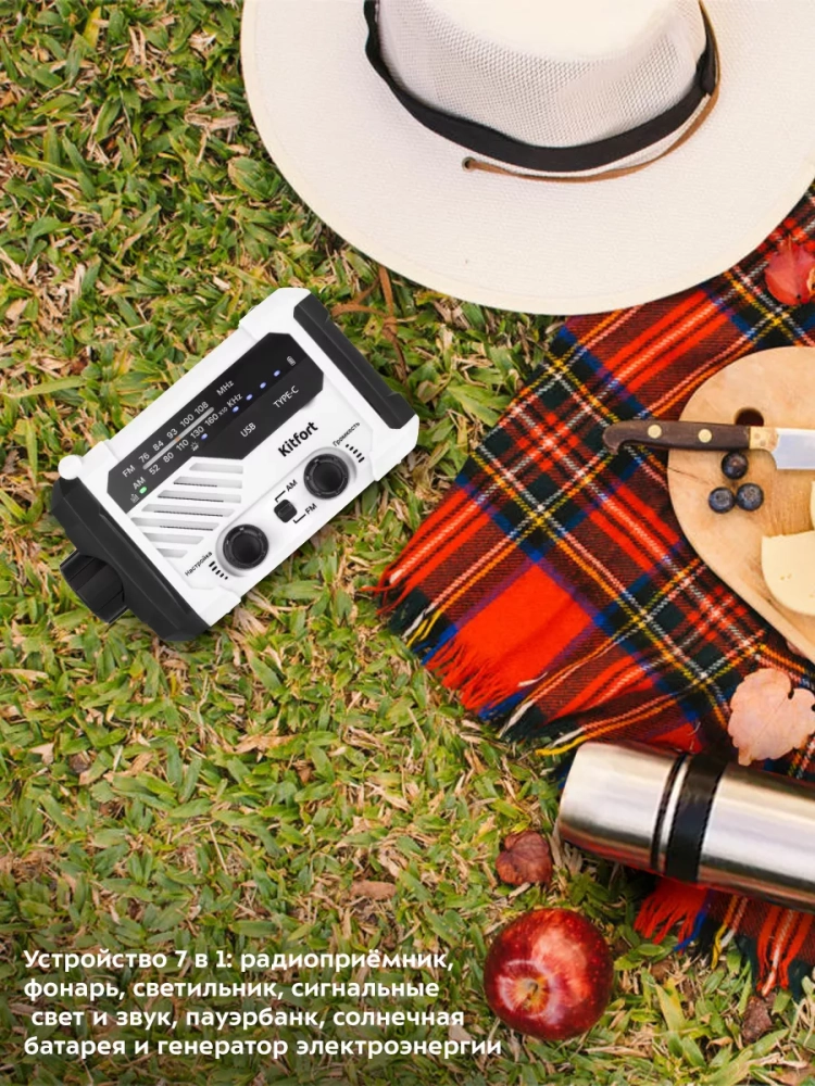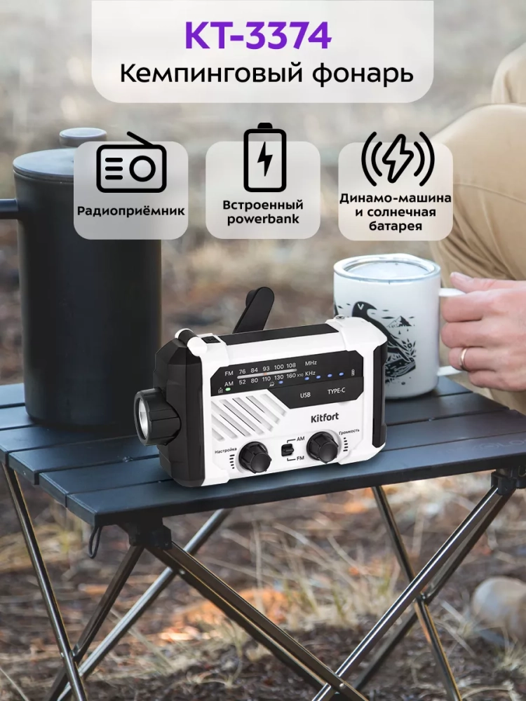 Кемпинговый фонарь «7 в 1» Kitfort KT-3374 — многофункциональное устройство для походов или путешествий, сочетающее в себе функции радиоприемника, фонаря, светильника, сигнальных света и звука, пауэрбанка, солнечной батареи и генератора электроэнергии. Генератор выполнен по принципу динамо-машины: на корпусе кемпингового фонаря есть ручка, при вращении которой генерируется электроэнергия. Кемпинг (в переводе с английского «Проживание в лагере») подразумевает вид туризма с проживанием в палатках. Устройство будет полезно также для рыбаков или любителей собирать в лесу грибы или ягоды.