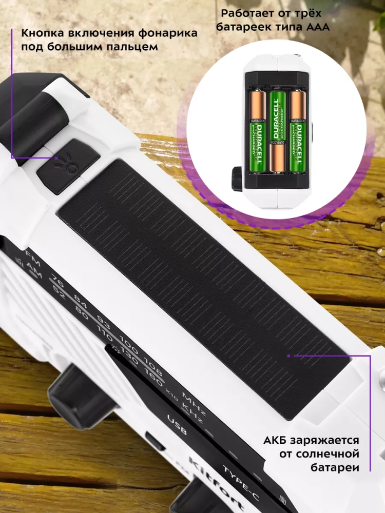 На верхней части устройства расположены антенна для радио, кнопка переключения света и солнечная батарея. На передней части расположены индикатор уровня заряда, регулятор громкости, переключатель FM/AM диапазона и переключатель частот, а также порт USB и разъем USB Type-C. Разъемы закрыты заглушкой для защиты от пыли, грязи или влаги. Ручка генератора расположена на обратной стороне и для удобства складывается в углубление на корпусе. Также в комплекте есть шнур для переноски.