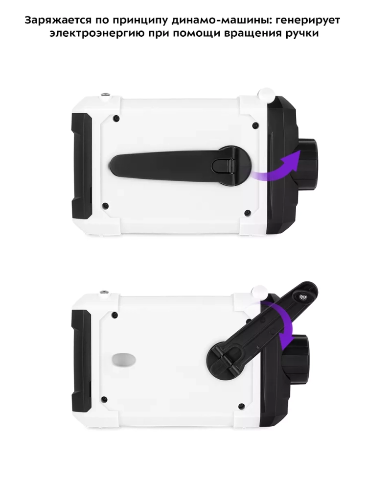 Кемпинговый фонарь питается от встроенного аккумулятора или трех батареек типа ААА (в комплект не входят). Если встроенный аккумулятор сел, вы можете зарядить его, вращая ручку генератора. Однако, необходимо учитывать, что генератор небольшой, а вращение ручки требует некоторых усилий и времени, поэтому полностью и быстро зарядить встроенный аккумулятор или мобильное устройство не получится.