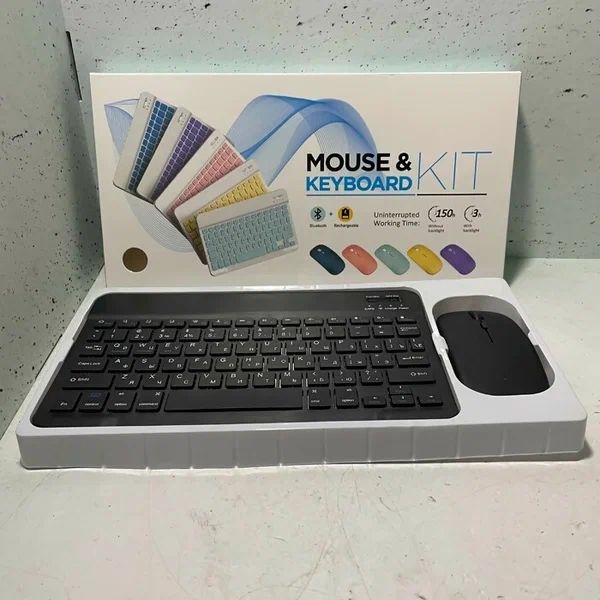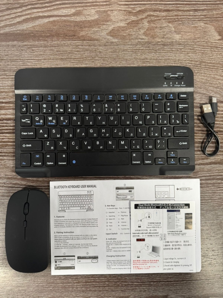 Беспроводные клавиатура и мышь подойдут к каждому гаджету с функцией Bluetooth. Портативные офисные аксессуары подключаются к планшету, смартфону и ноутбуку на Windows, macOS и Android. Так как на наличие блютус соединения встроенная операционная система и марка техники не влияют. Дополнительные компьютерные атрибуты созданы для комфортной работы и повседневных геймерских игр. Внешние пк приспособления с легким весом и компактным размером берите в офис и на учебу. Пользуйтесь в путешествии и командировке. Лазерная блютуз мышка эргономичная и беззвучная. Прочувствуйте рабочую и игровую атмосферу без раздражения родных и близких. Перед включением вставьте батарейку типа АА, в комплектацию батарея не входит. Миниатюрная толщина тонкой клавишной панели - 5 мм. Плоская мембранная клава создает мягкое и плавное нажатие клавиш при наборе текста. Клавиатурный аккумулятор заряжается от сети через USB. Зарядный кабель для аккумуляторной подзарядки в комплекте. Автономное использование до 150 часов или на 3 000 000 прикосновений каждой кнопки позволит играть или печатать удаленно, применяя монитор подключенного компьютера, айпада, экран телефона на андроиде или дисплей айфона. Забудьте о проводах! Наслаждайтесь полноценным и эстетичным комфортом. Чувствуйте свободу в каждом движении. Переферийные устройства станут оригинальным подарком начальнику, руководителю и другу - геймеру.