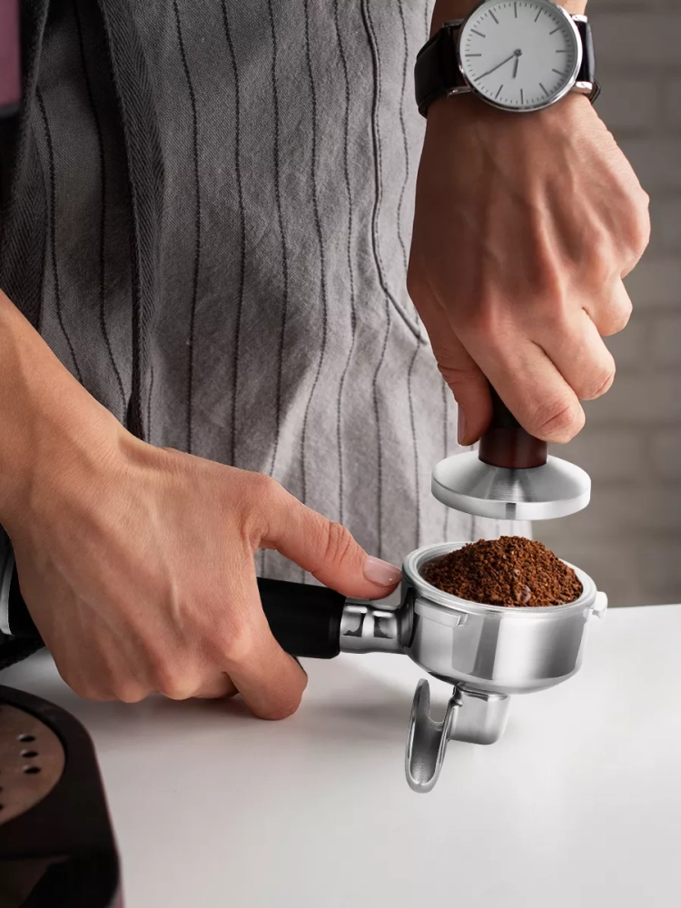 Ключевым отличием кофейной станции от других кофеварок, турок и прочих кофейных устройств является наличие рожка, его часто называют холдер. Молотый кофе помещается в фильтр рожка и прессуется в таблетку. Процесс трамбовки также называют темперовкой.