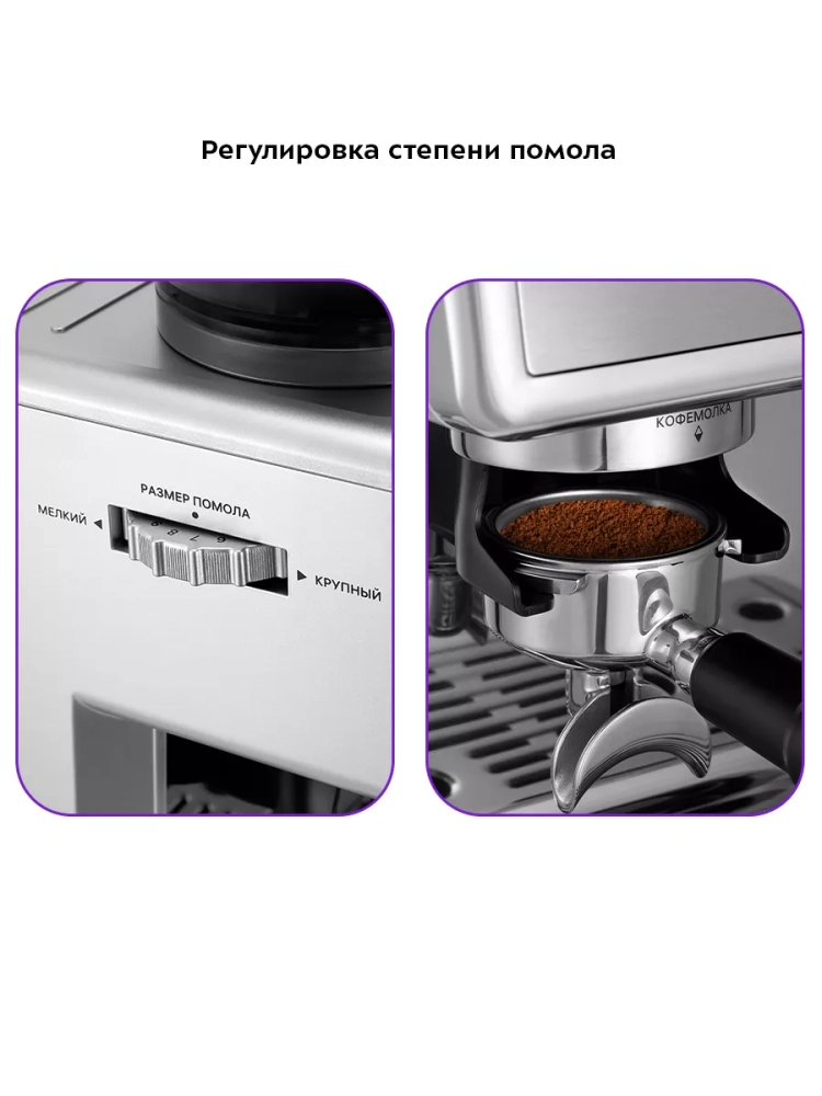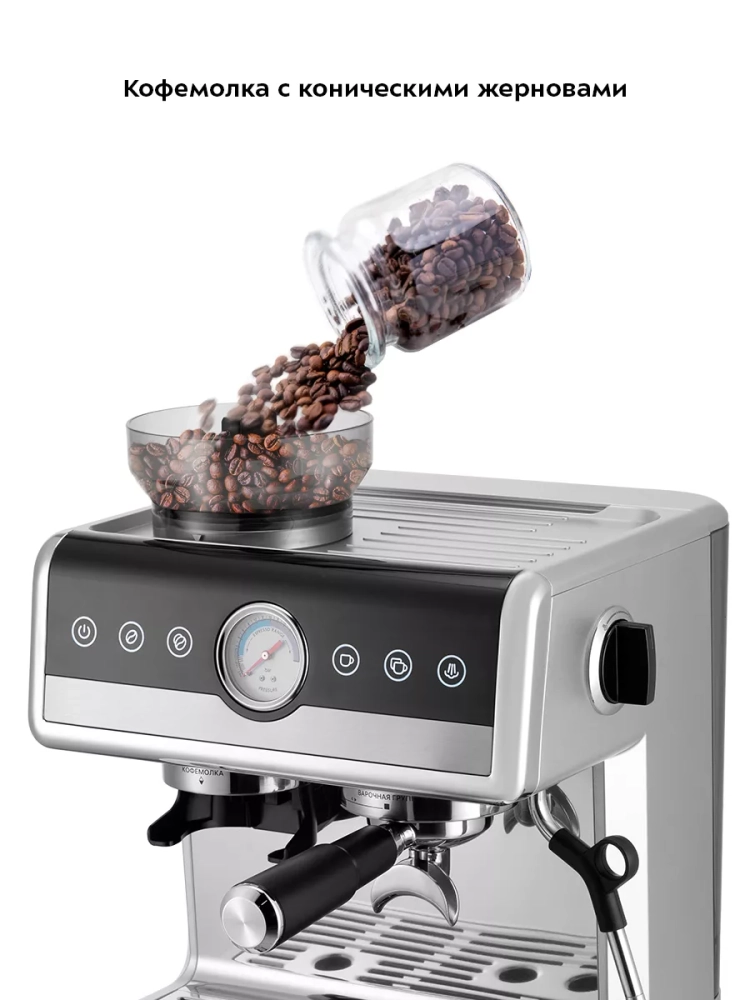 Но не стоит забывать, что вкус и качество кофе зависит от сорта, степени обжарки и помола кофейных зерен. Встроенная кофемолка с коническими жерновами, которые препятствуют излишнему перегреванию зерен при помоле, позволяет получить свежемолотый кофе и настроить степень помола. Также кофемолка с коническими жерновами позволяет получить равномерный помол, что положительно сказывается на вкусе эспрессо.