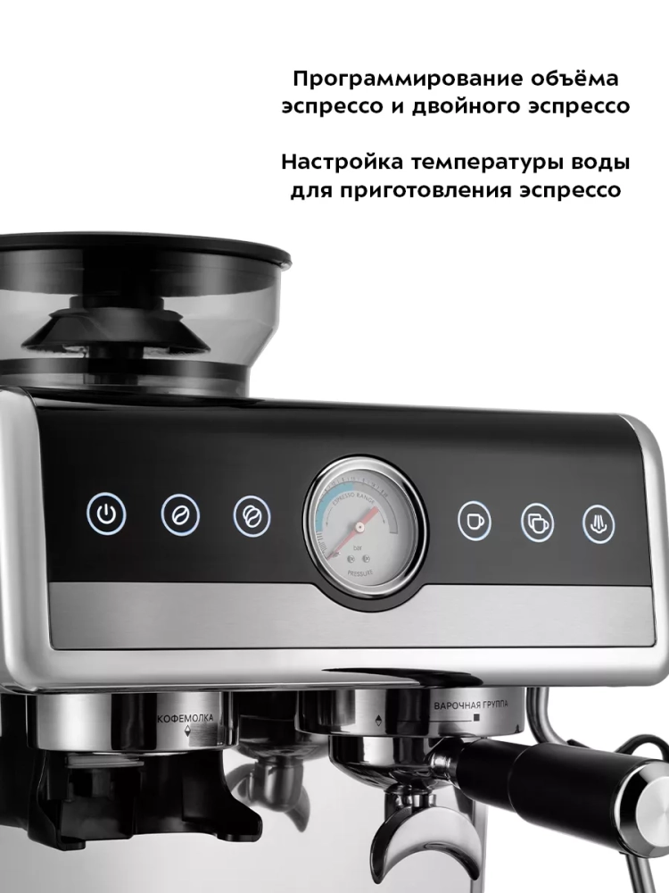 Металлический рожок хорошо прогревает напиток, и кофе получается насыщенным, густым и с хорошей пенкой. Металлические фильтры с лазерным нанесением отверстий долговечны и не требуют использования каких-либо расходующихся частей. Темпер поможет утрамбовать в фильтре кофейную таблетку.