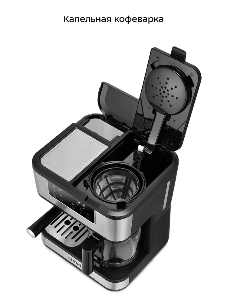 Кофейная станция Kitfort KT-7524 — это универсальная электрическая кофемашина, которая сочетает в себе функции рожковой и капельной кофеварки. Эта техника идеально подходит для кухни дома, обеспечивая приготовление разнообразных видов кофе. Рожковая кофеварка позволяет насладиться эспрессо, капучино или латте, используя помпу для создания насыщенного вкуса. Капельная кофеварка, в свою очередь, готовит крепкий фильтр-кофе, который бодрит и придаёт сил.