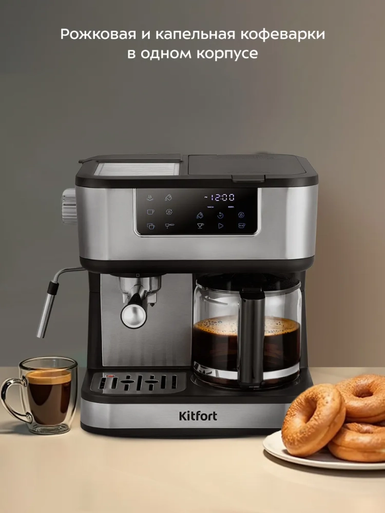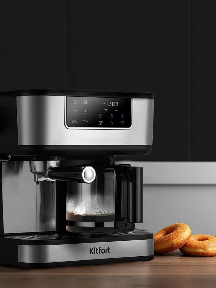 Эта кофемашина совместима с различными фильтрами и подходит для использования с зерновым и молотым кофе. Она легко впишется в интерьер любой кухни, добавив ей функциональности и стиля. Кофемашина Kitfort — это пионер в мире бытовой техники, предлагающий высокое качество и надёжность. С её помощью вы сможете наслаждаться любимыми напитками каждый день, не выходя из дома.