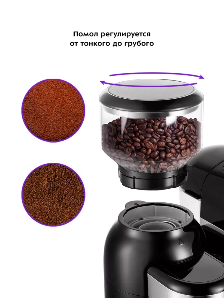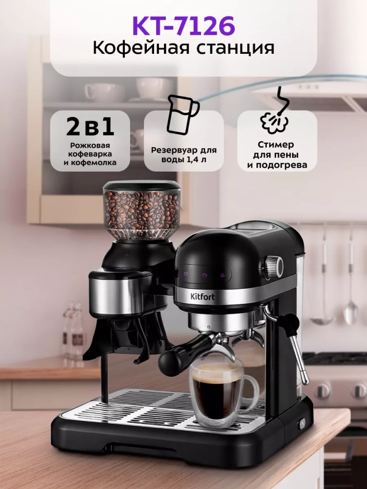 Кофейная станция Kitfort КТ-7126 сочетает в себе два устройства в одном корпусе. Встроенная кофемолка с коническими металлическими жерновами позволяет качественно измельчать кофейные зерна непосредственно перед приготовлением кофе, что положительно отражается на вкусе готового напитка.