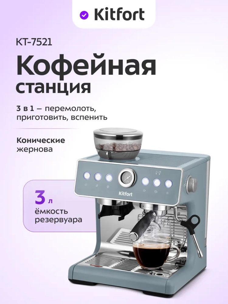 Кофейная станция Kitfort КТ-7521 сочетает в себе два устройства в одном корпусе. Встроенная кофемолка с коническими металлическими жерновами позволяет измельчать кофейные зерна непосредственно перед приготовлением кофе, что положительно отражается на вкусе готового напитка. Кофейная станция поможет приготовить эспрессо, американо, капучино или латте, а также множество других видов кофе на ваш вкус. С помощью стимера вы можете приготовить молочную пенку, а также подогреть паром остывший чай или другие напитки.
