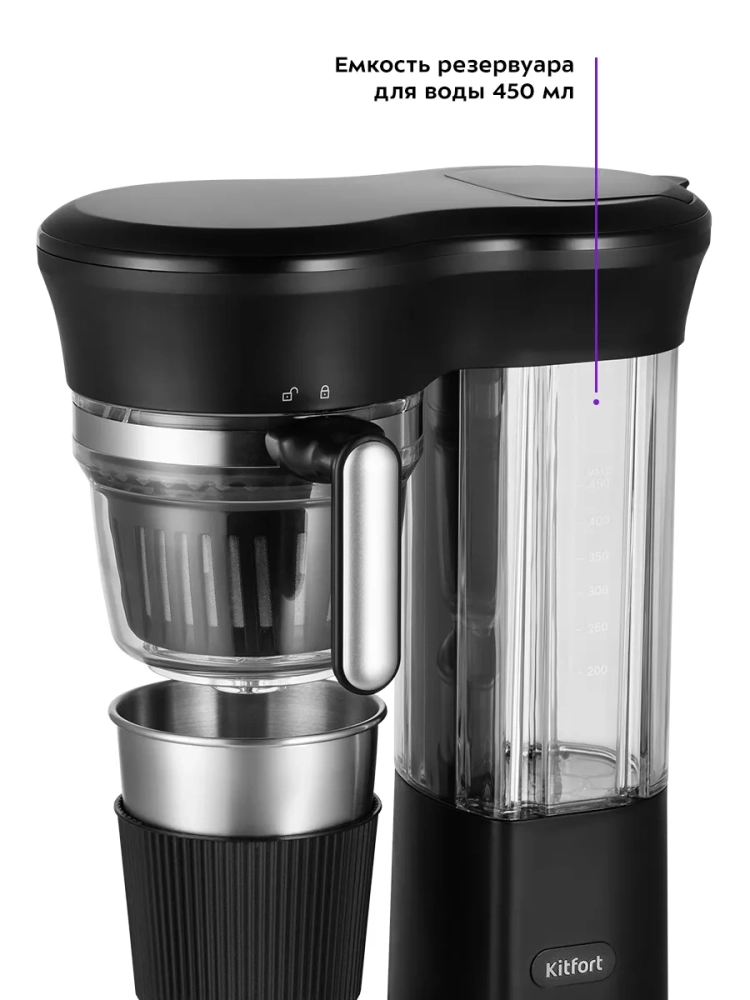 Резервуар для воды емкостью 450 мл позволяет за один раз приготовить кофе на 1 большой стакан, который входит в комплект или 5 маленьких (по 90 мл) чашек.