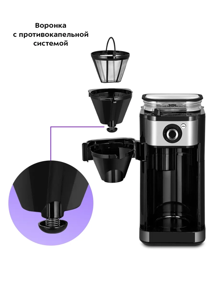 Воронка кофемашины оборудована противокапельной системой — затвором, приостанавливающим подачу кофе при вынимании кофейника из кофемашины. Вы можете налить кофе в чашку, не дожидаясь окончания приготовления.