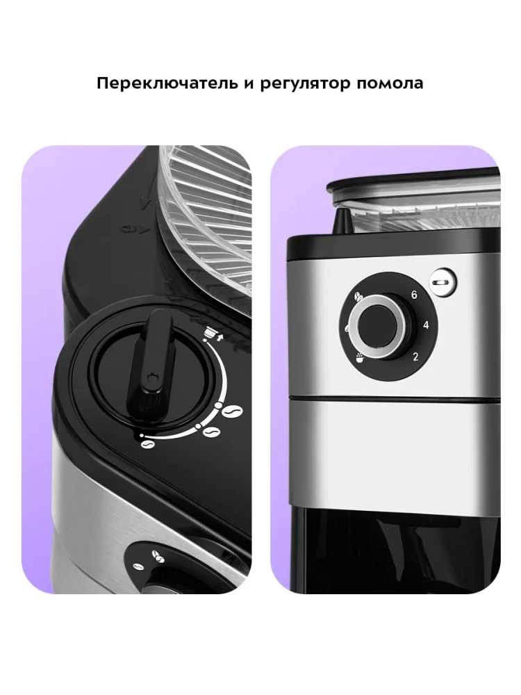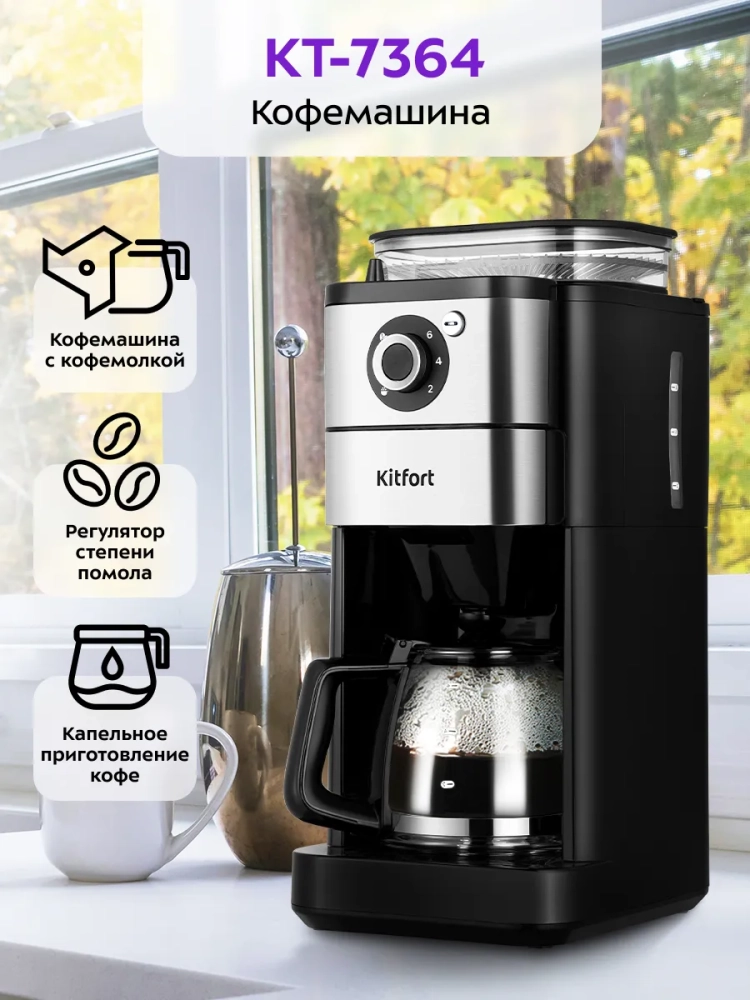 Капельная кофемашина Kitfort КТ-7364 готовит ароматный кофе из молотого кофе или из кофейных зерен. Встроенная кофемолка с коническими жерновами автоматически измельчит кофейные зерна и подаст их сразу в фильтр.