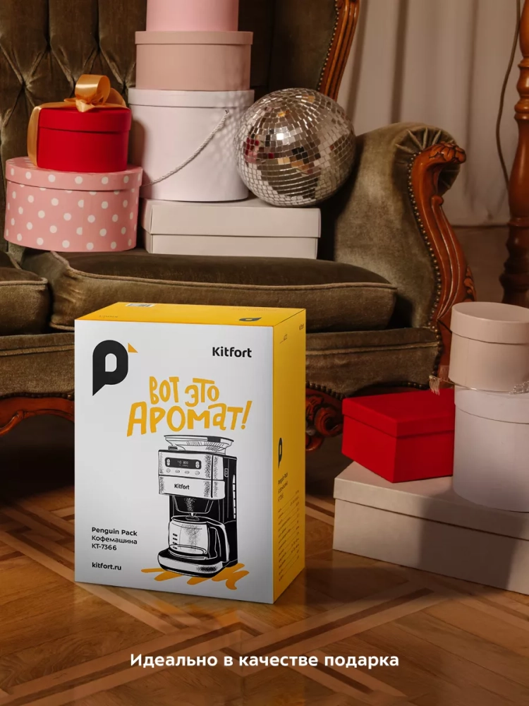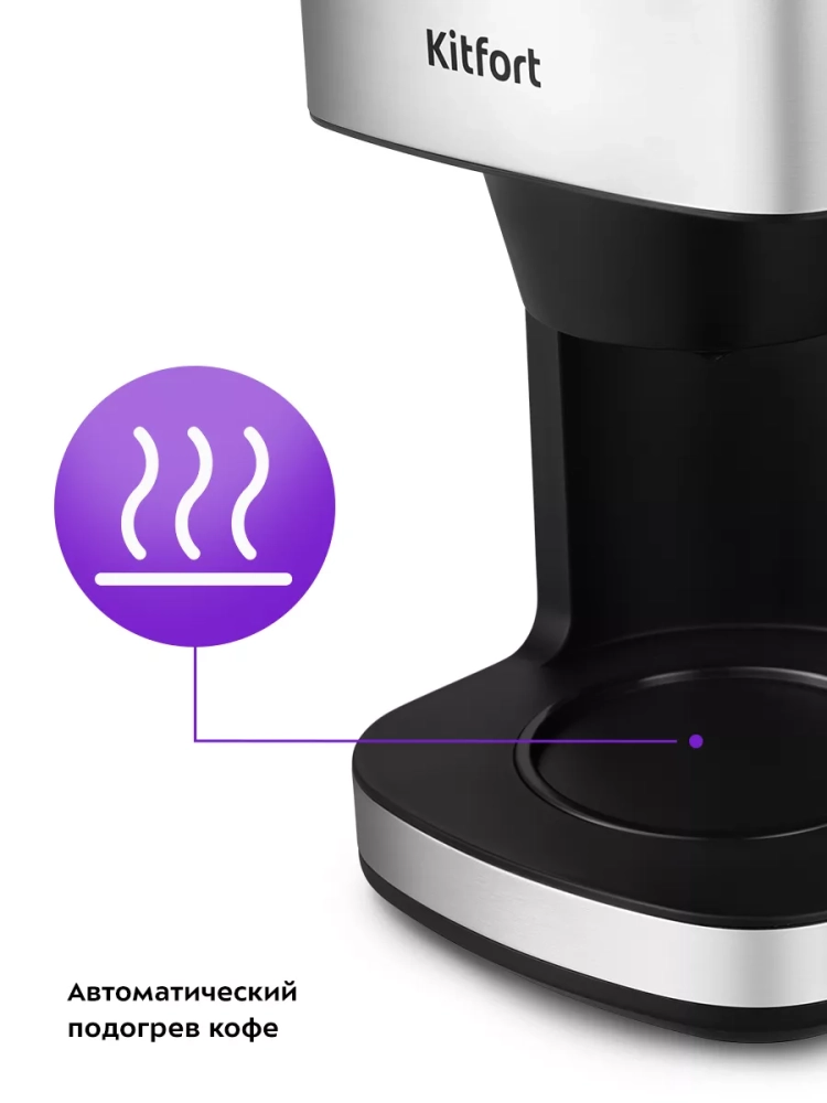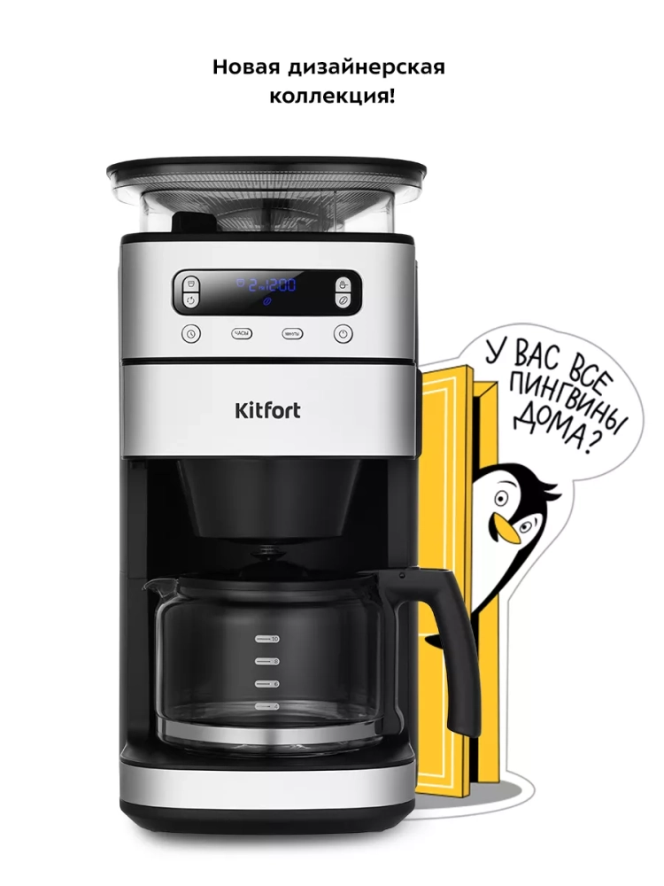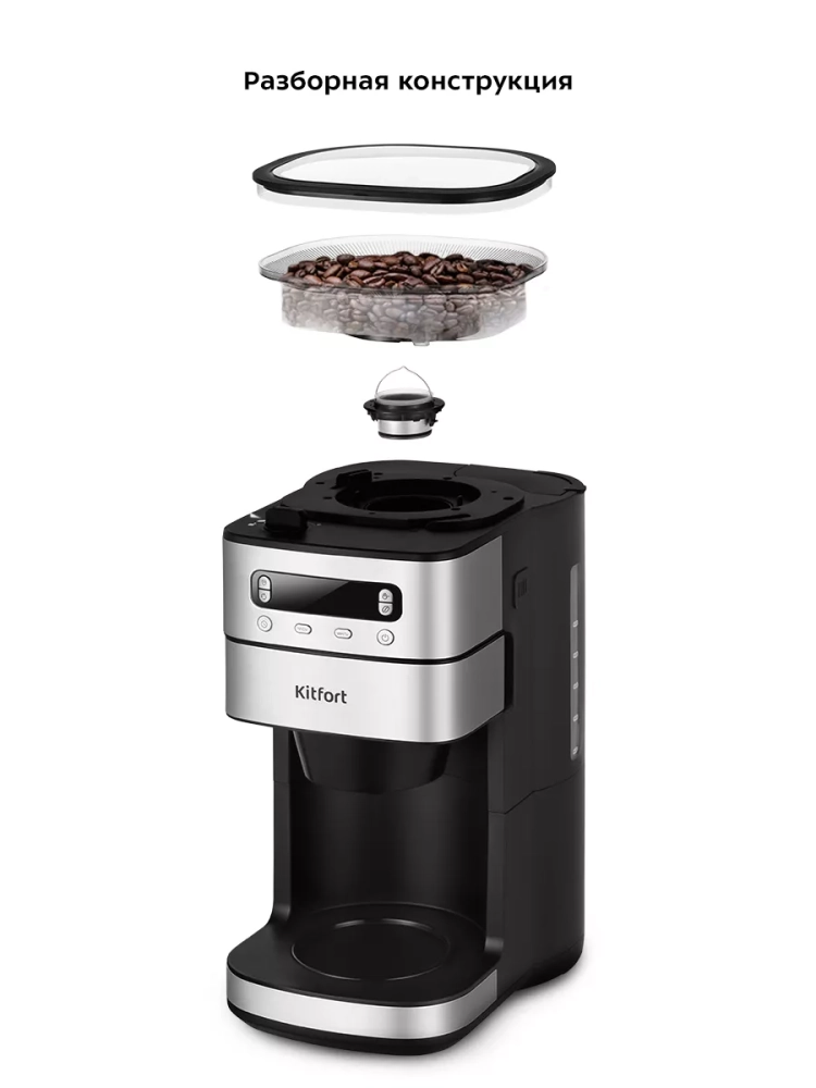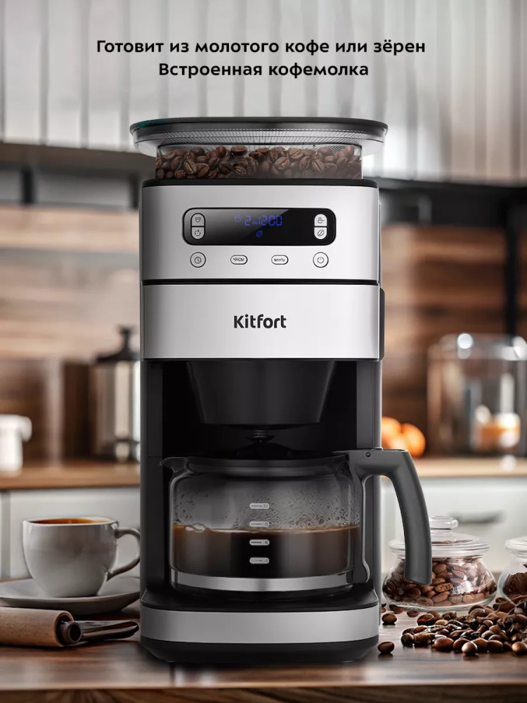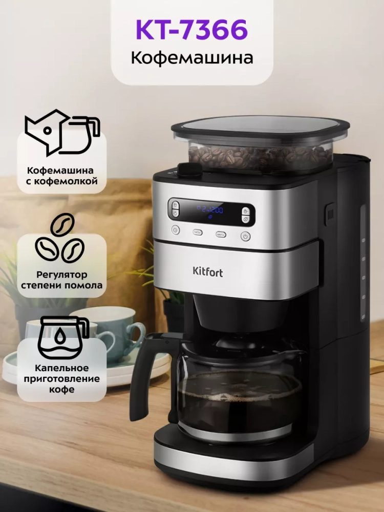 Капельная кофемашина Kitfort КТ-7366 готовит ароматный кофе из молотого кофе или из кофейных зерен. Встроенная кофемолка с коническими жерновами автоматически измельчит кофейные зерна и подаст их сразу в фильтр. Вы можете выбрать одну из трех степеней помола.