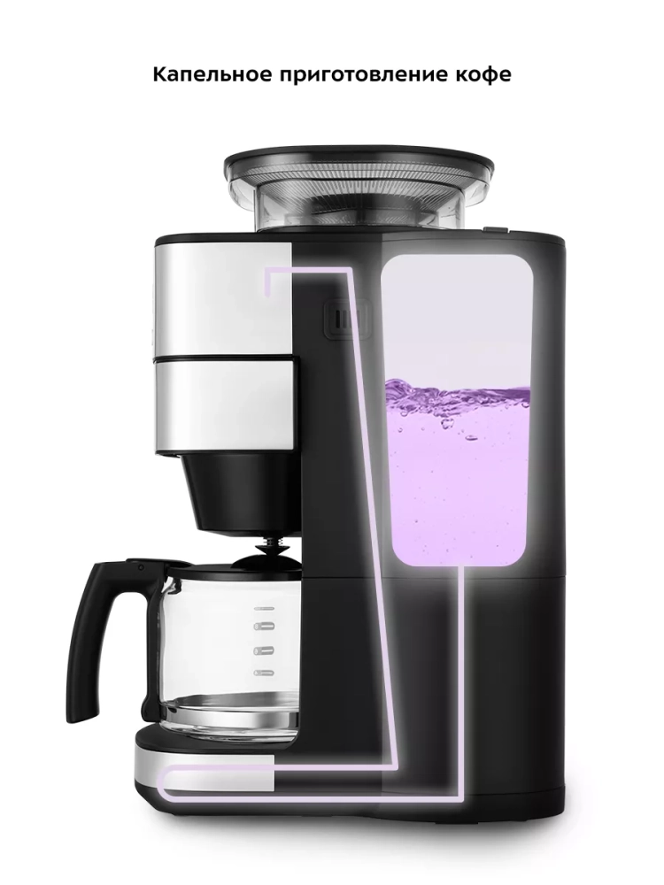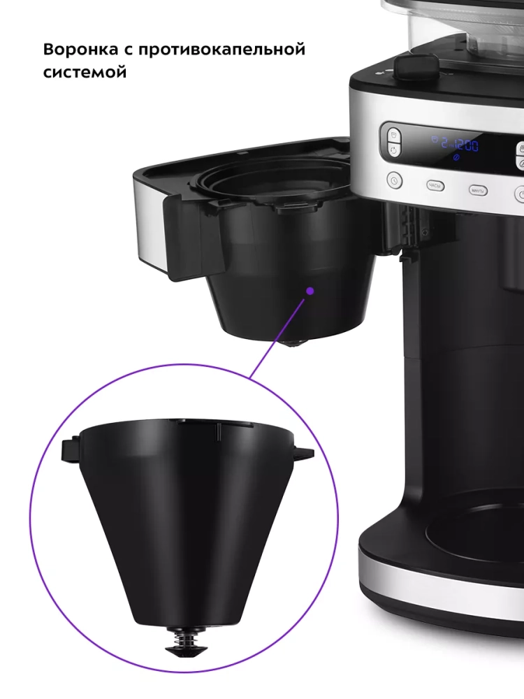 Воронка кофемашины оборудована противокапельной системой — затвором, останавливающим подачу кофе при вынимании кофейника из кофемашины. Вы можете налить кофе в чашку, не дожидаясь окончания приготовления.