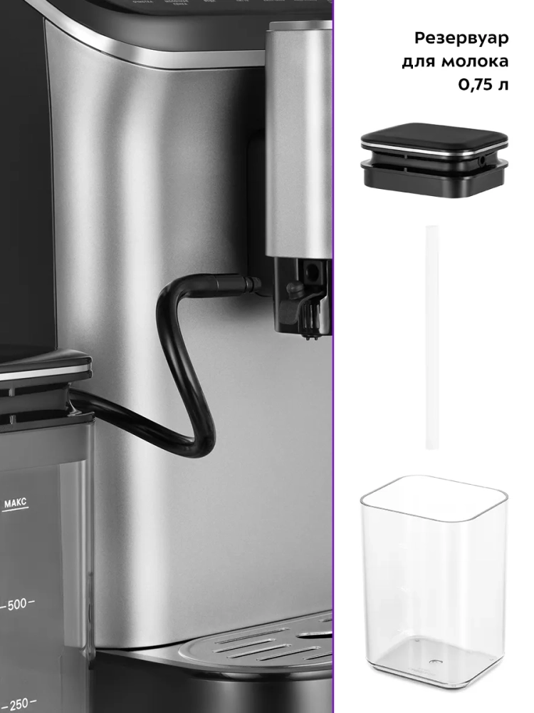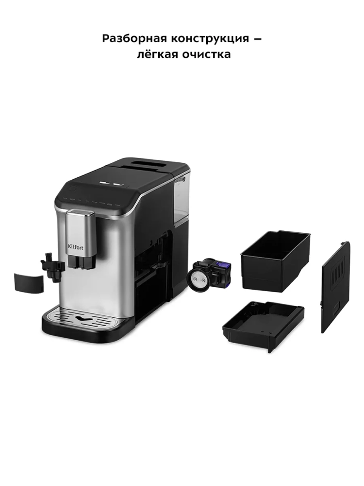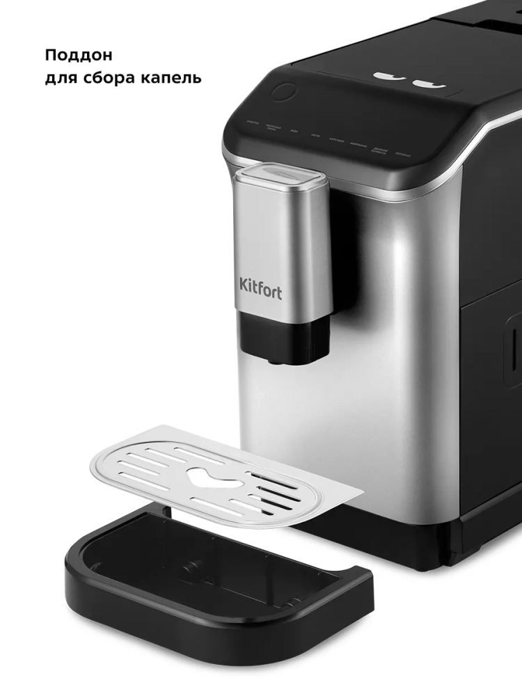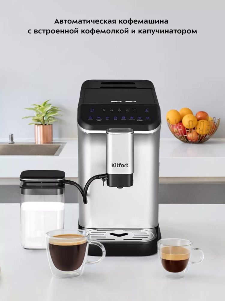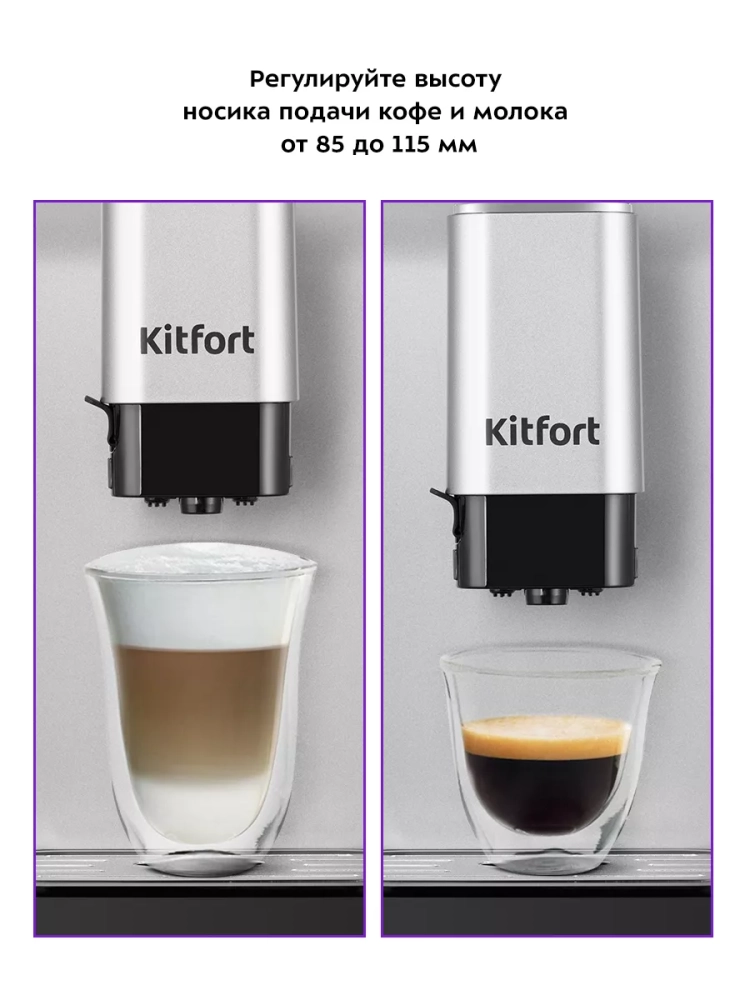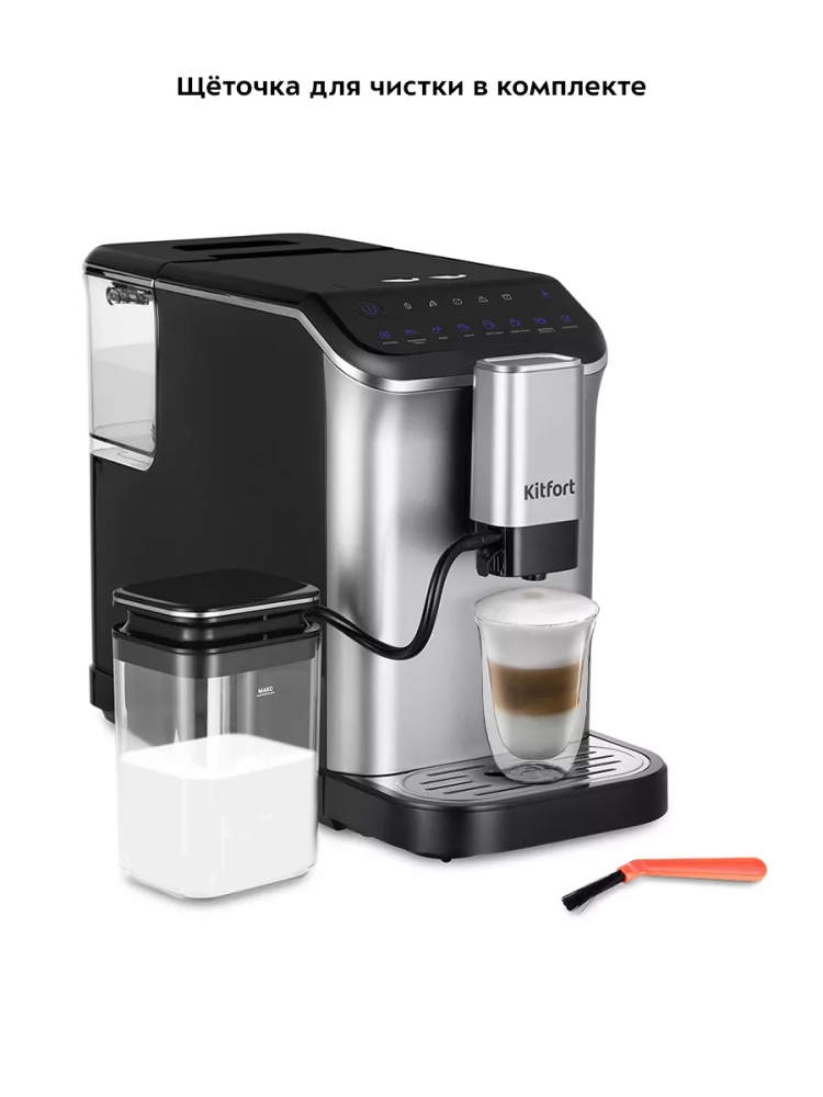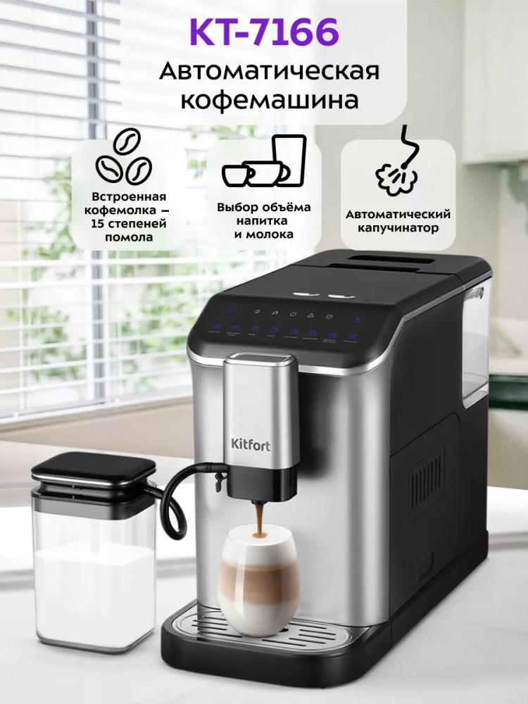 В автоматической кофемашине Китфорт КТ-7166 вы можете установить объем эспрессо, двойного эспрессо и американо, а также выбрать объем кофе и молока для капучино и латте.