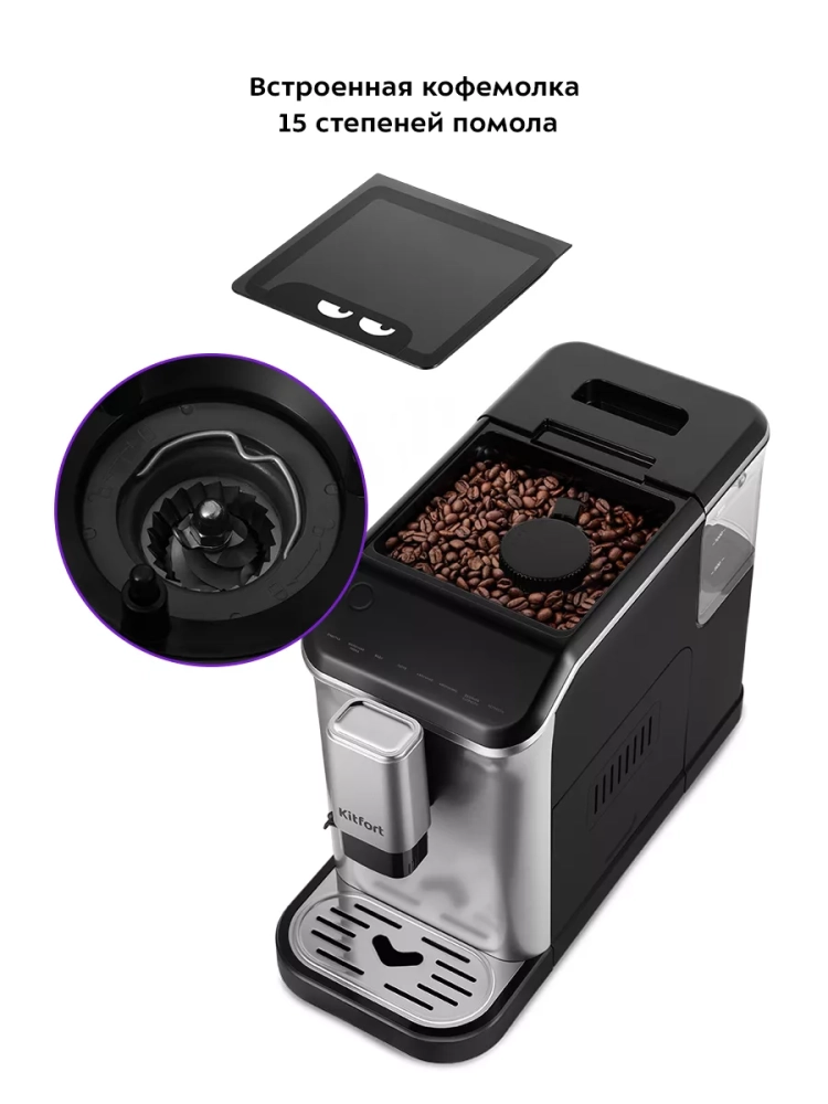 Встроенная кофемолка с коническими металлическими жерновами позволяет качественно измельчать кофейные зерна непосредственно перед приготовлением кофе, что положительно отражается на вкусе готового напитка. Кофемолка имеет металлические конические жернова, которые препятствуют излишнему перегреванию зерен при помоле и позволяют получить равномерный помол. Кофемолка имеет 15 степеней помола. Регулировка степени помола осуществляется путем изменения расстояния между жерновами.