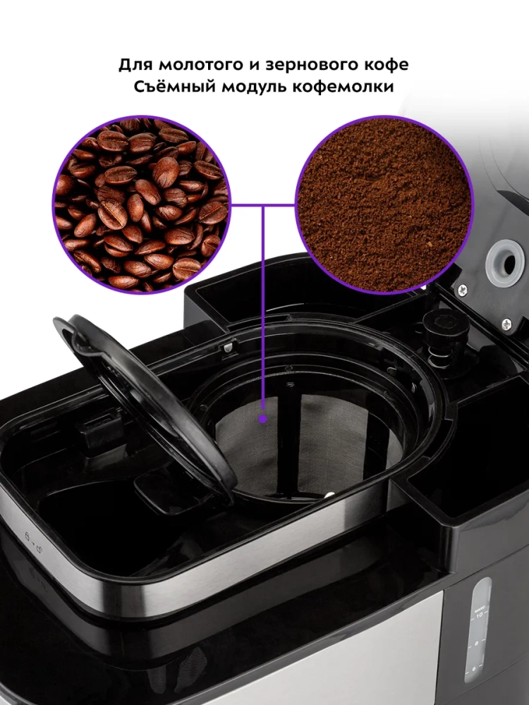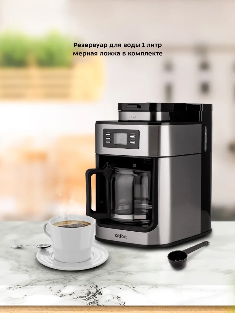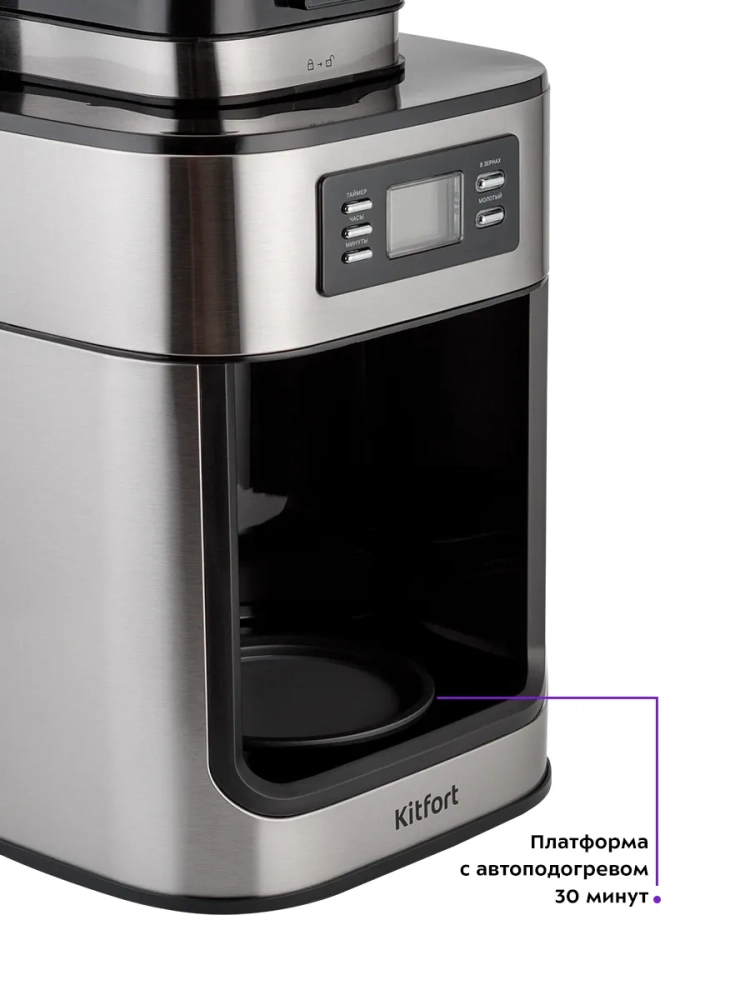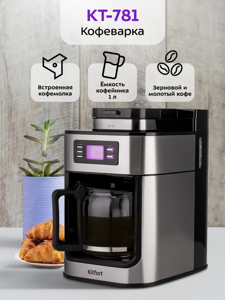 Капельная кофемашина Kitfort КТ-781 готовит ароматный кофе одним нажатием кнопки. Встроенная кофемолка автоматически измельчит кофейные зерна сразу в фильтре. В капельной кофемашине вода доводится до температуры 80–90 *С, после чего медленно поступает в фильтр с молотым кофе. Пройдя через него, она попадает в кофейник. По окончании приготовления напитка кофемашина перейдет в режим подогрева. Платформа с подогревом, на которой стоит кофейник с готовым кофе, будет горячей в течение 30 минут, затем кофемашина выключится. Звуковой сигнал известит вас об окончании работы платформы с подогревом. Кофемашина оборудована противокапельной системой — затвором, приостанавливающим подачу кофе при вынимании кофейника из кофемашины. Вы можете налить кофе в чашку, не дожидаясь окончания приготовления. Резервуар для воды емкостью 1 л позволяет за один раз приготовить кофе на 5 больших (по 200 мл) или 10 маленьких (по 100 мл) чашек. Корпус кофейника прозрачный, поэтому вы всегда можете видеть, сколько кофе еще осталось. У кофемашины КТ-781 есть LCD-дисплей с понятными обозначениями всех программ. Вы можете видеть текущее время на часах на дисплее. Функция автозапуска позволит начать приготовление кофе в заданное время. Вам больше не придется вставать на 20 минут раньше, чтобы успеть сделать себе ароматный кофе. Установите время автозапуска, и к моменту, когда прозвенит будильник, вас будет ждать ароматный свежезаваренный кофе. Резервуар для воды на 1 л оснащен мерной шкалой, благодаря которому вы сможете с легкостью приготовить кофе в необходимом количестве. Кофемашина предназначена для приготовления кофе в домашних условиях или в офисе.