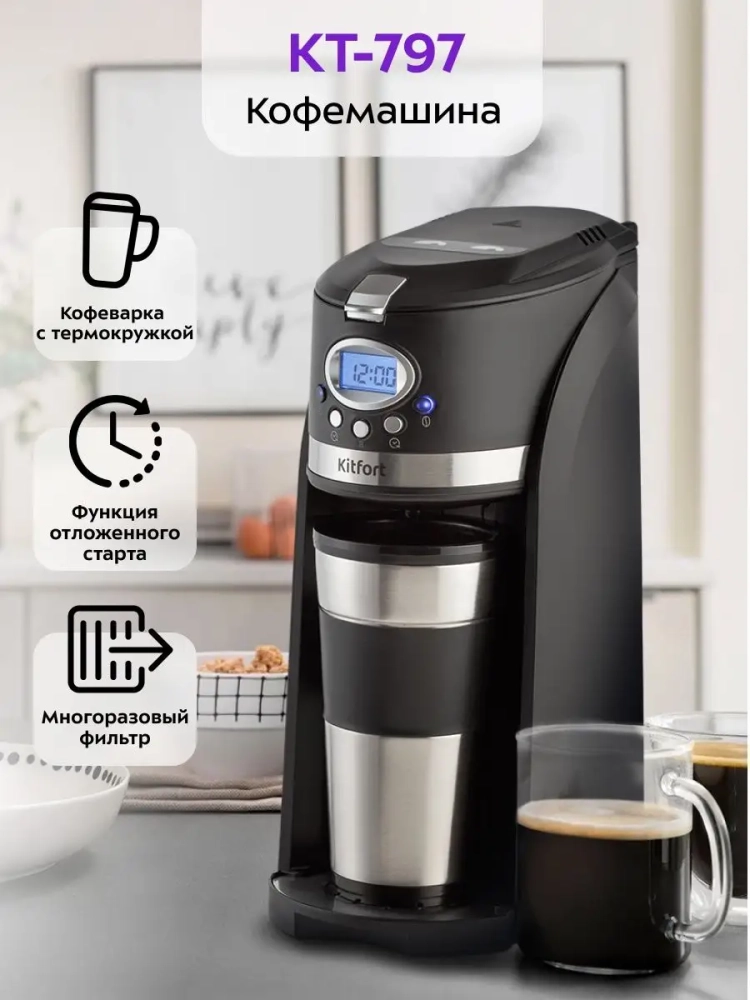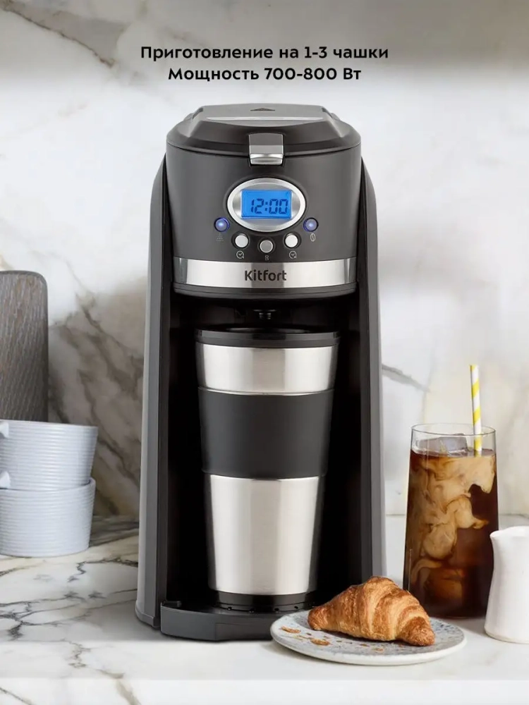 Кофемашина Kitfort КТ-797 готовит ароматный черный кофе по принципу капельной кофеварки одним нажатием кнопки. Встроенная роторная кофемолка автоматически измельчит кофейные зерна сразу в фильтре. В кофемашине вода доводится до температуры 80–90 *С, после чего медленно поступает в фильтр с молотым кофе. Пройдя через него, она попадает в термокружку, которая сохранит тепло вашего кофе. Термокружка выполнена из нержавеющей стали с силиконовой вставкой, которая не дает вам обжечься или выронить из рук термокружку. Крышка термокружки позволяет пить кофе на ходу, благодаря удобной форме отверстия для питья, которое можно закрывать, например, при ходьбе. Сетка фильтра кофемашины изготовлена из нержавеющей стали, что значительно продлевает срок службы фильтра. Кофемашина KT-797 не скользит по поверхности стола, благодаря наличию прорезиненных ножек. Компактная кофемашина KT-797 рассчитана на приготовление кофе за 1 раз на 1–3 чашки. Многоразовый фильтр вмещает 20 грамм кофейных зерен или молотого кофе. А в резервуаре для воды есть специальные отметки 300, 360 и 420 мл, которые помогают налить необходимый объем воды для приготовления кофе. Кофемашина KT-797 оборудована дисплеем, который показывает текущее время и заданные настройки. Функция отложенного старта позволит начать приготовление в заданное вами время. Вам больше не придется вставать утром на 20 минут раньше, чтобы успеть сделать себе ароматный кофе. Также кофемашина оснащена поддоном для сбора капель, который защищает поверхность стола. Кофемашина предназначена для приготовления кофе в домашних условиях или в офисе.