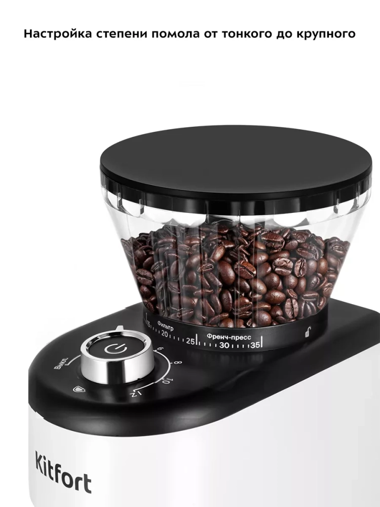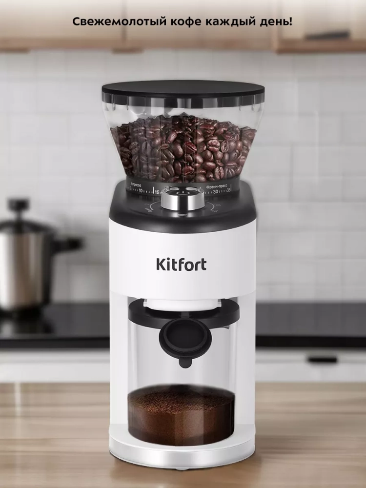 Жерновая кофемолка Kitfort КТ-7205 предназначена для помола кофейных зерен. Она оснащена коническими металлическими жерновами.