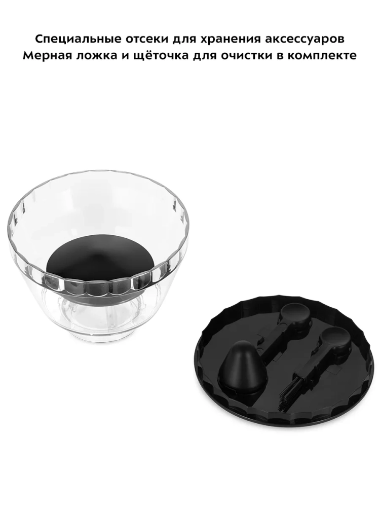 Контейнер для зерен и молотого кофе съемный. Внешний жернов также съемный — для удобства очистки. Для чистки жерновов в комплекте идет щеточка.