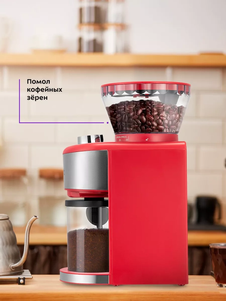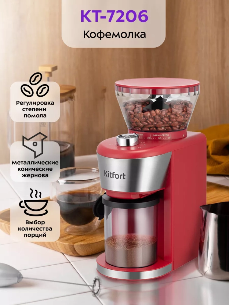 Жерновая кофемолка Kitfort КТ-7206 предназначена для помола кофейных зерен. Она оснащена коническими металлическими жерновами. Жерновая кофемолка дает равномерный помол и позволяет настроить его степень: от мелкого — для эспрессо, до крупного — для кофе во френч-прессе. Равномерный помол важен для рожковых кофеварок: он положительно влияет на вкус эспрессо. При помоле в жерновой кофемолке кофе не перегревается, как это происходит в роторных кофемолках. Вы можете выбрать, какое количество кофе требуется смолоть за один раз. Кофемолка смелет нужное количество кофе и автоматически отключится. Конические жернова — это два конуса, один в другом. Внешний конус остается неподвижным, а внутренний вращается. Зерно, попадая между жерновами, перемалывается, продвигаясь вниз. Такие жернова позволяют перемалывать зерна за короткий промежуток времени, не перегревая их. Контейнеры для молотого кофе и для зерен съемные и закрываются крышками. Внешний жернов также съемный — для удобства очистки. В комплекте предусмотрены мерная ложка и щетка для чистки жерновов. Кофемолка оснащена переключателем безопасности: она не включится, если контейнер для зерен не установлен или установлен неправильно. Кофемолка автоматически отключается после 3 минут непрерывной работы. Затем необходимо сделать перерыв на 30 минут, чтобы прибор остыл. В случае перегрева мотора сработает защита от перегрева и отключит прибор.