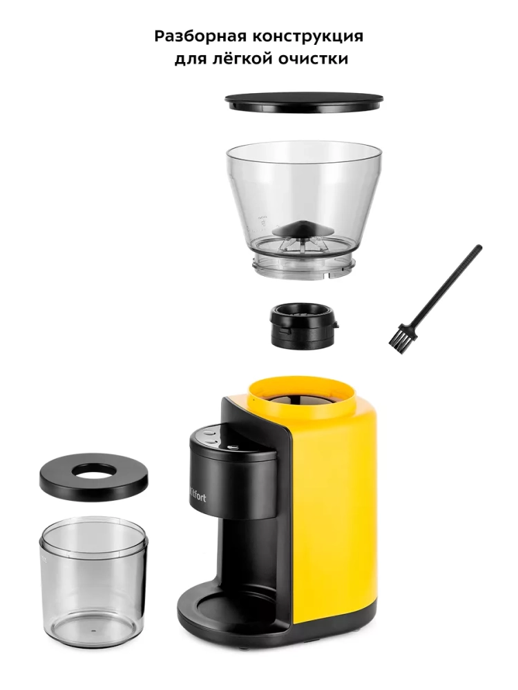 Контейнеры для молотого кофе и для зерен съемные. Внешний жернов также съемный — для удобства очистки. Для чистки жерновов в комплекте идет щеточка.