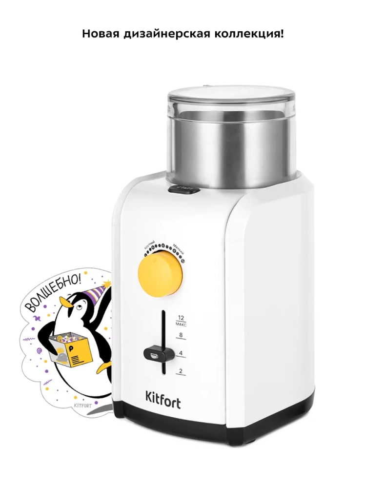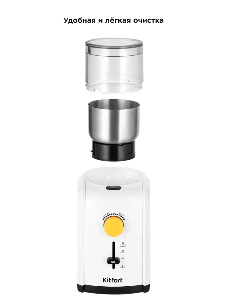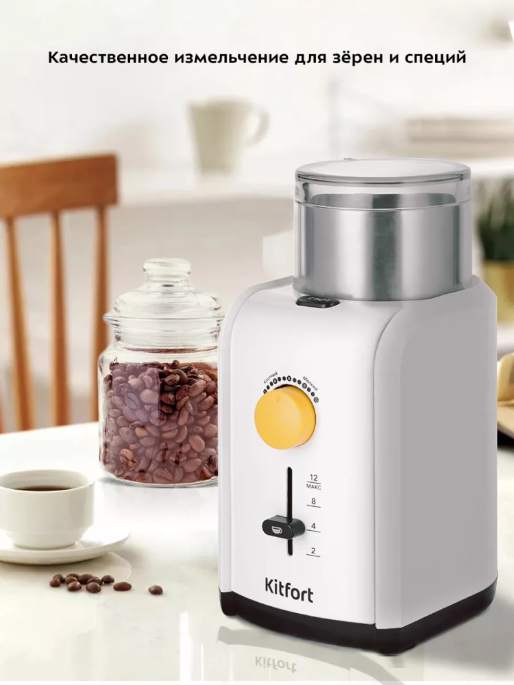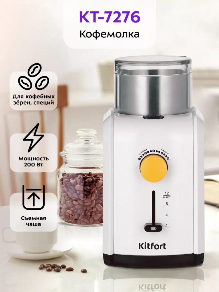 Кофемолка Kitfort КТ-7276 предназначена для помола кофейных зерен и измельчения специй. В чаше установлен блок ножей для эффективного измельчения зерен кофе и специй. Эти ножи при включении кофемолки быстро вращаются и рубят зерна. Степень помола зависит от продолжительности работы. Через прозрачную крышку кофемолки можно наблюдать за процессом измельчения.