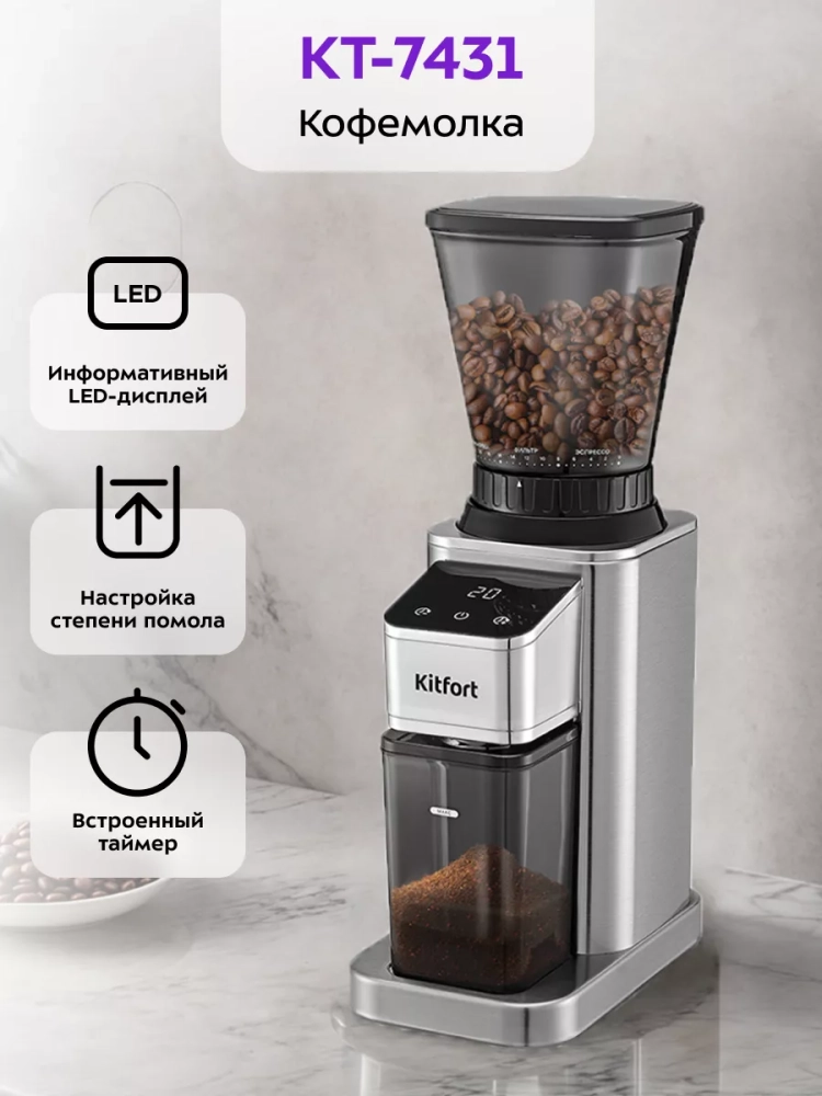 Жерновая кофемолка Kitfort КТ-7431 предназначена для помола кофейных зерен. Устройство оснащено коническими жерновами из нержавеющей стали.