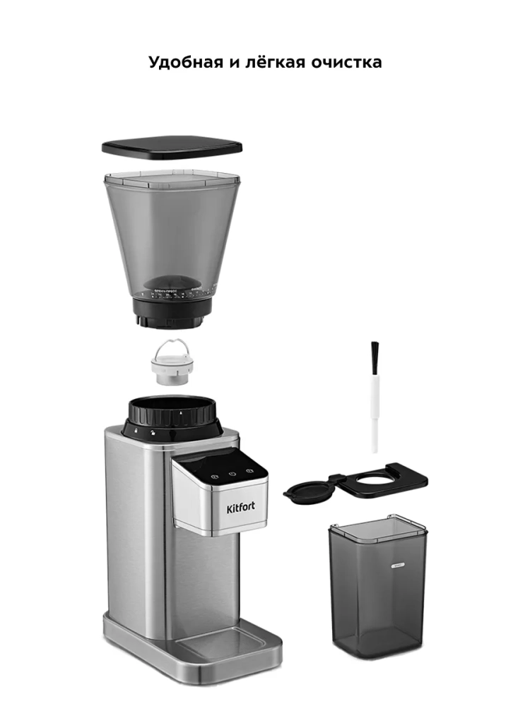 Контейнеры для молотого кофе и для зерен съемные и закрываются крышками. Внешний жернов также съемный — для удобства очистки. В комплекте предусмотрена щетка для чистки жерновов.