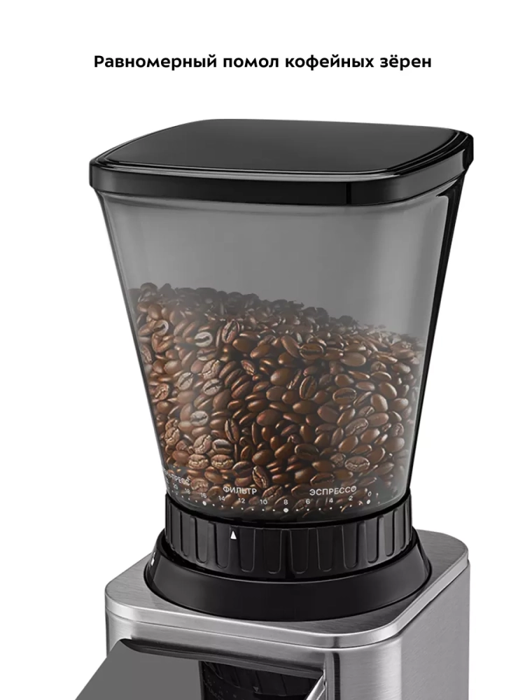 Кофемолка оснащена переключателем безопасности: она не включится, если контейнер для зерен не установлен или установлен неправильно.