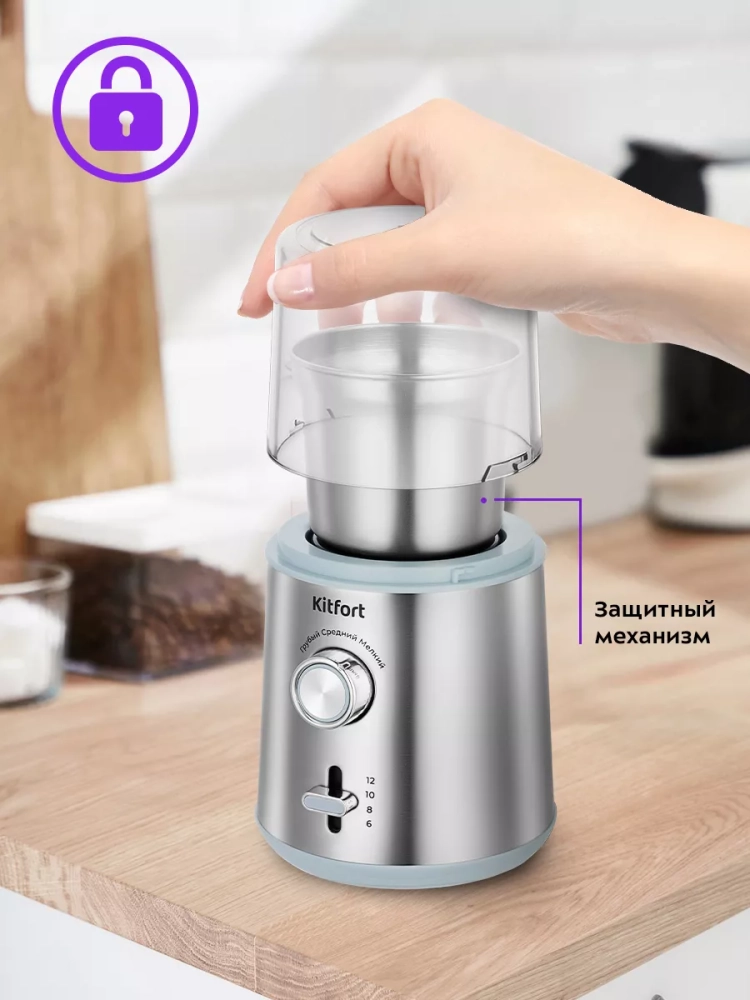 Роторная кофемолка Kitfort КТ-7250 предназначена для помола кофейных зерен и измельчения специй и орехов. Кофемолка укомплектована съемной чашей из нержавеющей стали и прозрачной крышкой. В чаше установлен двухлезвийный нож-дробилка для эффективного измельчения зерен кофе или специй.
